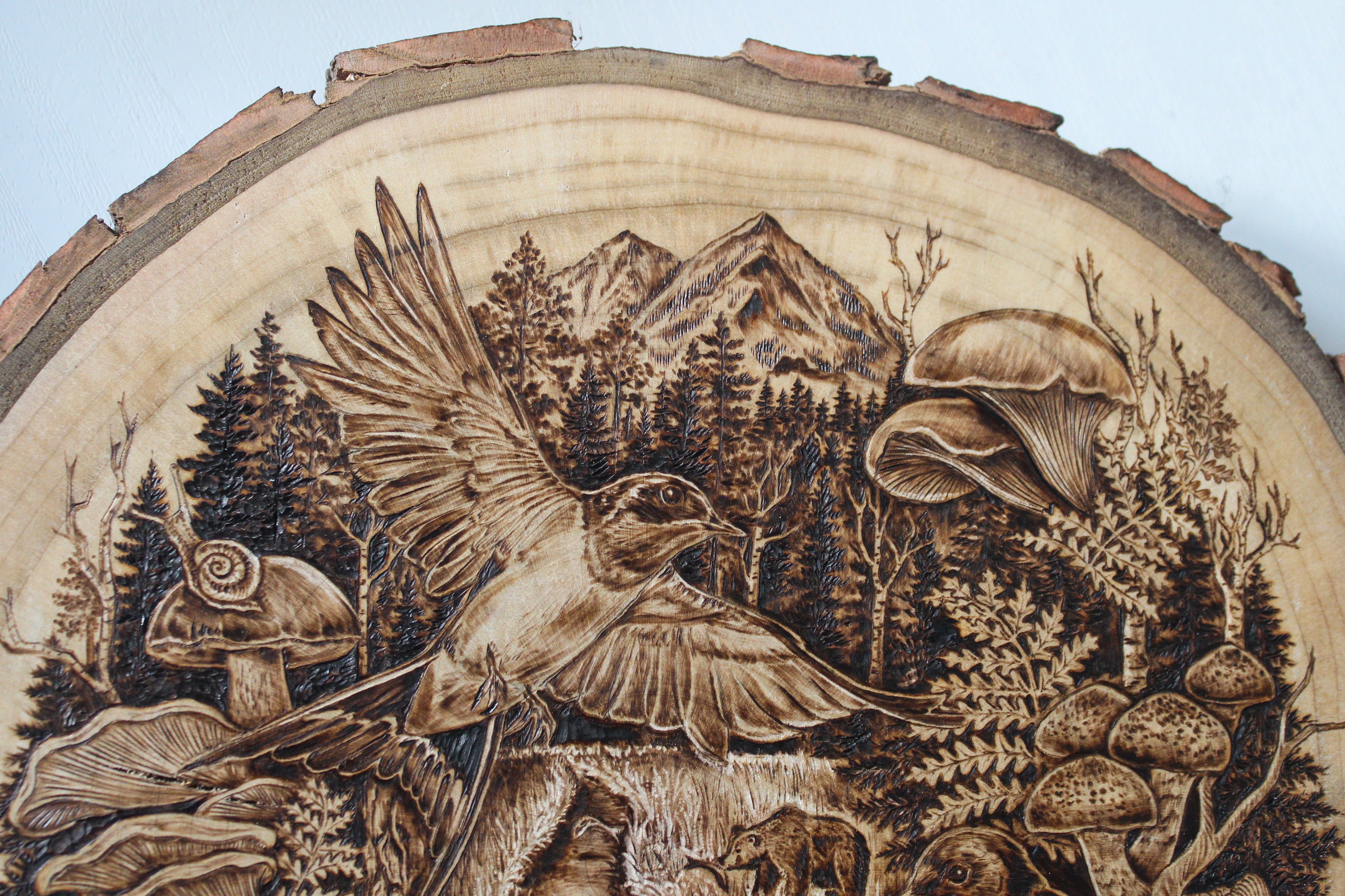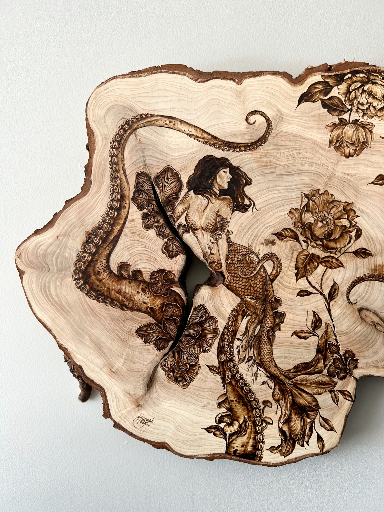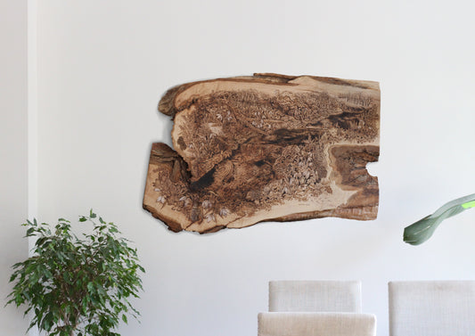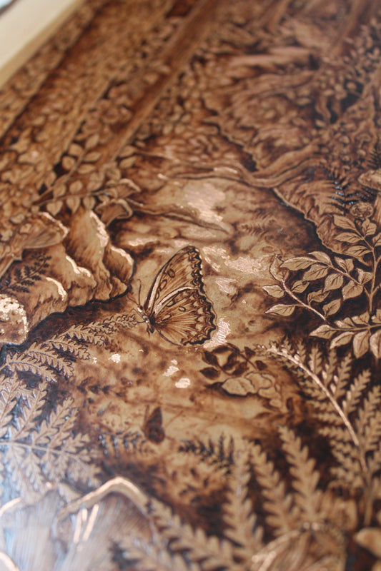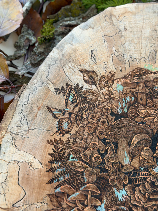 Here lives original wood burnings by Hannah Veiga, inspired by her love of flora, fungi and all things nature. She builds intricate worlds within the shape and grain of natural-edge wood, creating a place the viewer can escape to and take all the time they need to explore. Her work embodies themes of growth, decay, rebirth, and finding solitude and curiosity in the process of it all.