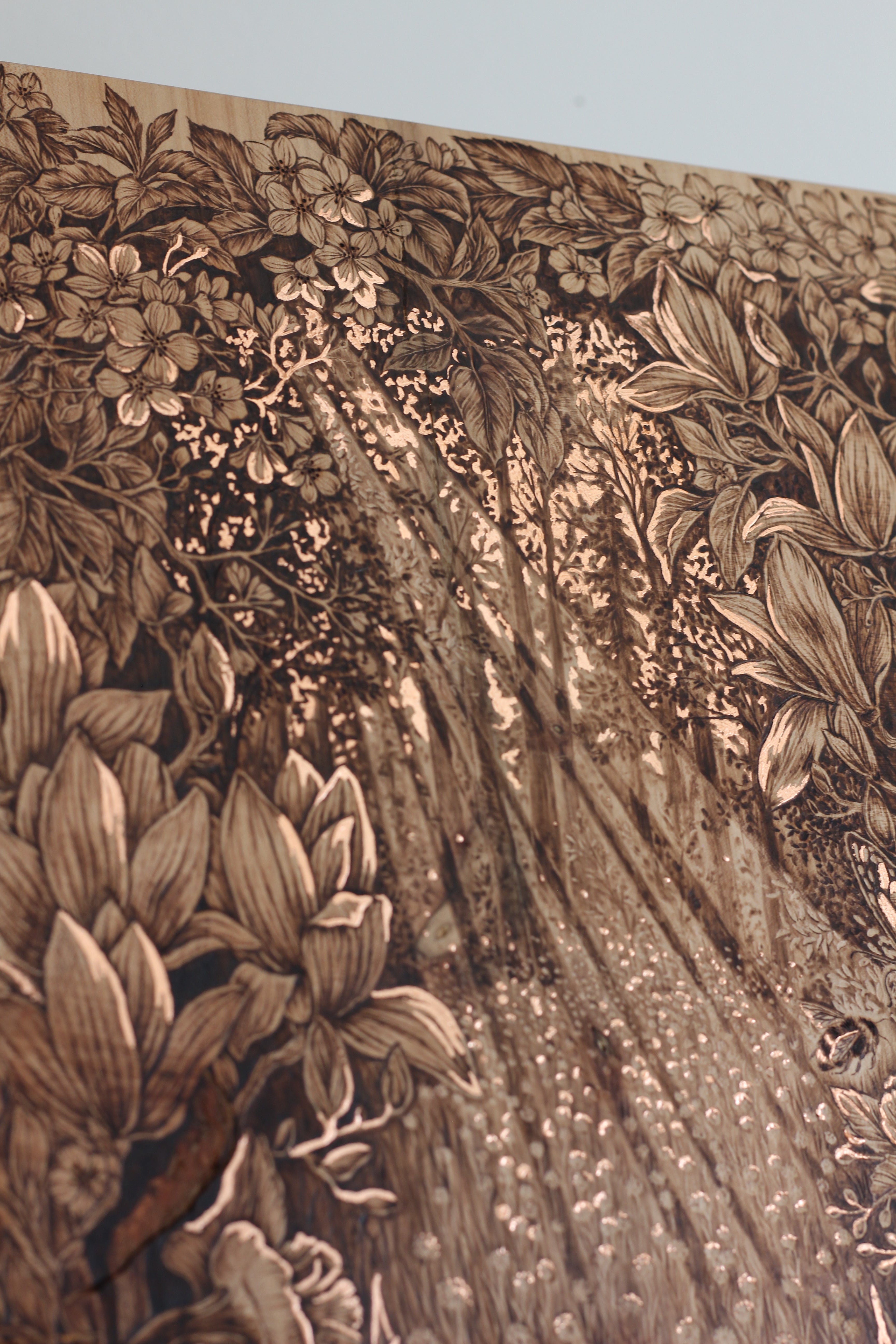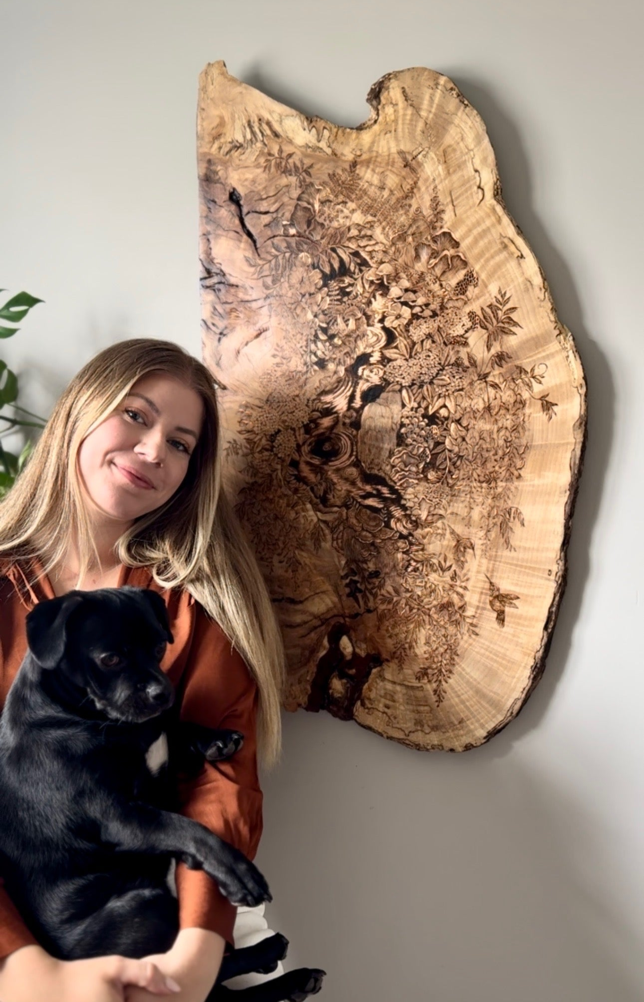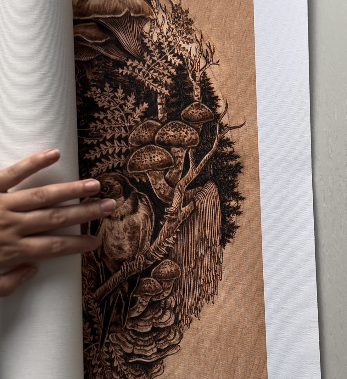 Here lives original wood burnings by Hannah Veiga, inspired by her love of flora, fungi and all things nature. She builds intricate worlds within the shape and grain of natural-edge wood, creating a place the viewer can escape to and take all the time they need to explore. Her work embodies themes of growth, decay, rebirth, and finding solitude and curiosity in the process of it all.