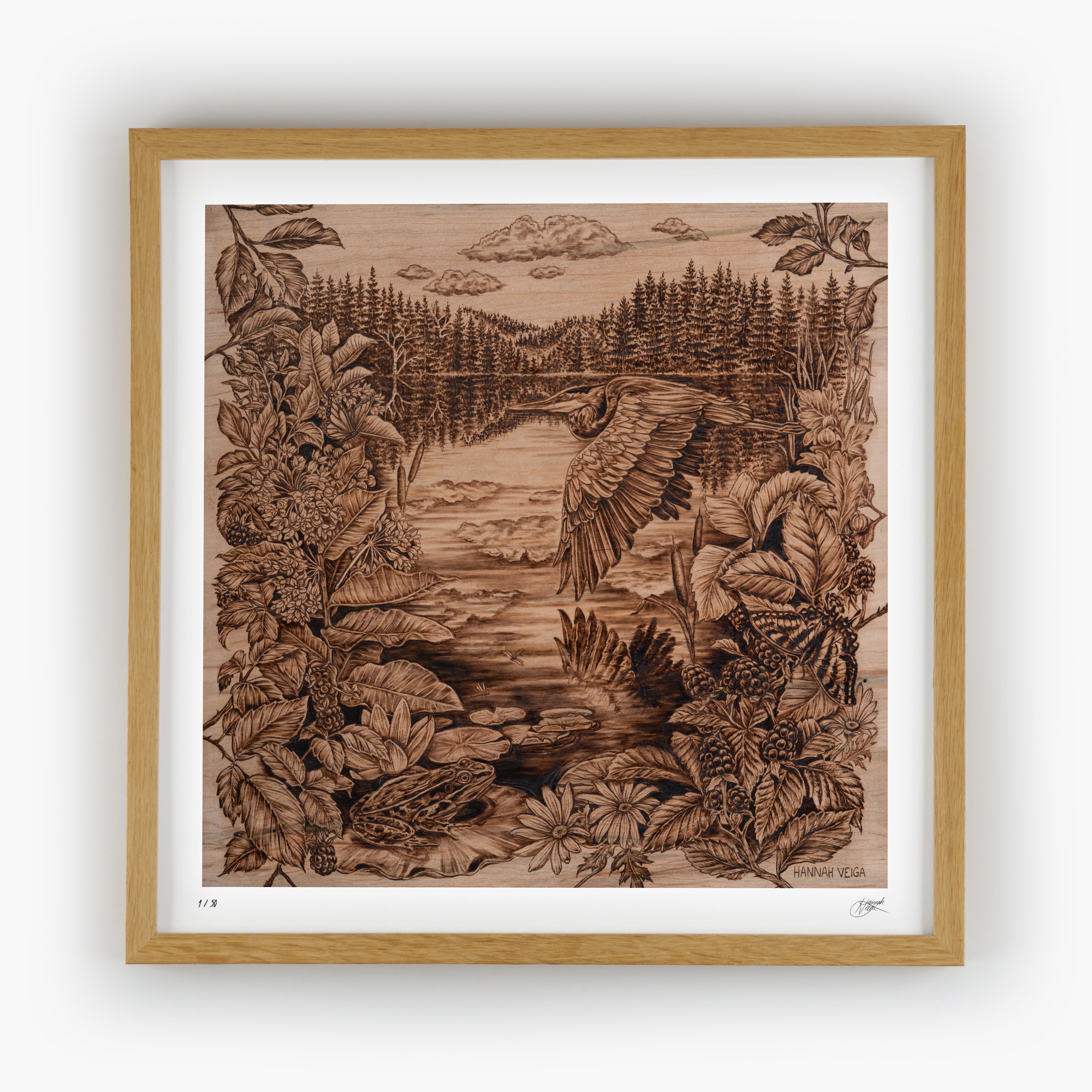 “On an Exhale” embraces all the familiar moments found in nature nearing the end of summer. Inspired by my findings during many evenings spent paddling on the lake, this woodburning reminisces on the memories of dragonflies dancing across blooming lily pads, a forage of berries, and the swoop of a heron’s wing across the water that halted my breath. In both the stillness and the life that is held in these moments, on an exhale, we can know all will be okay.