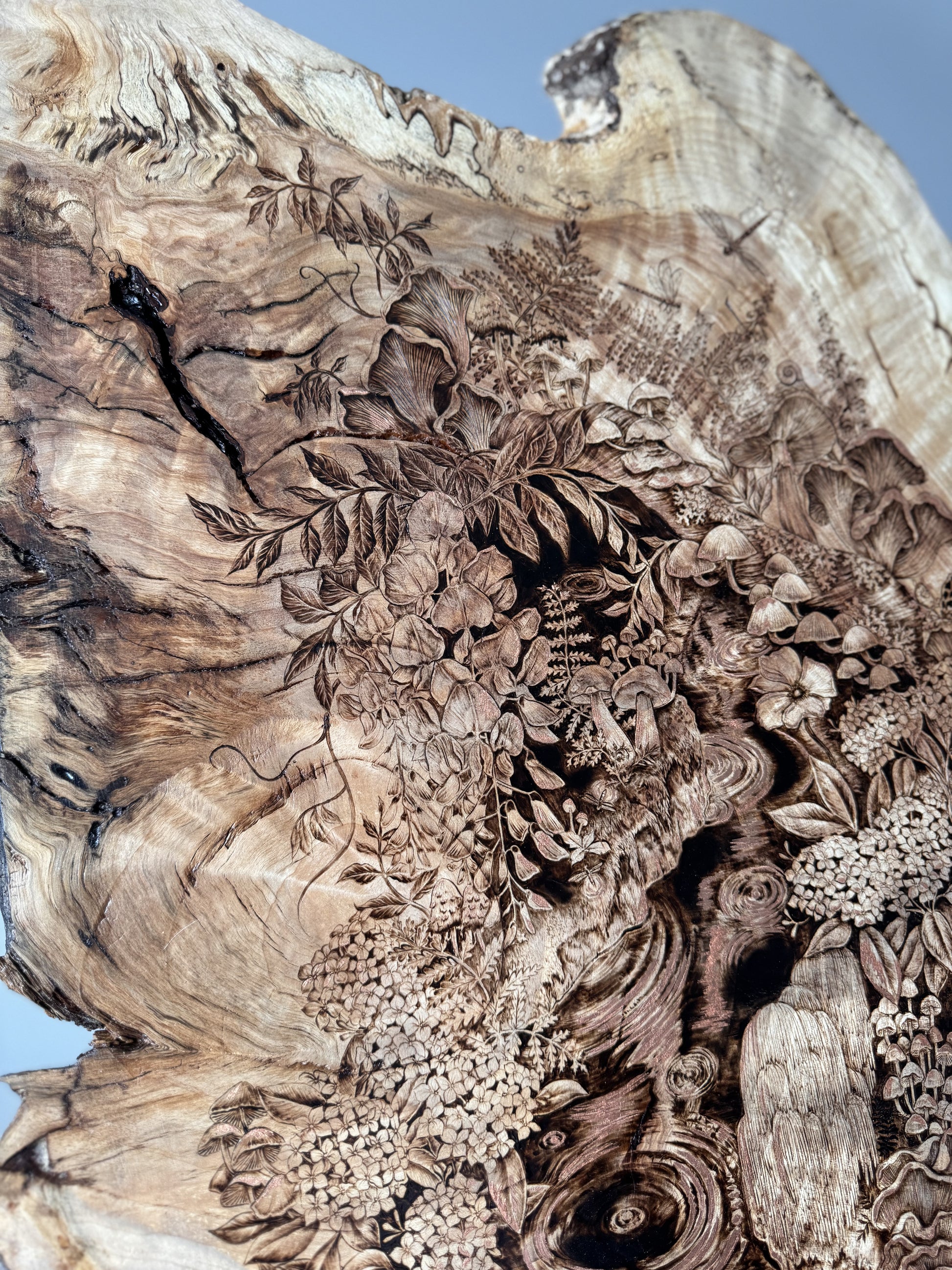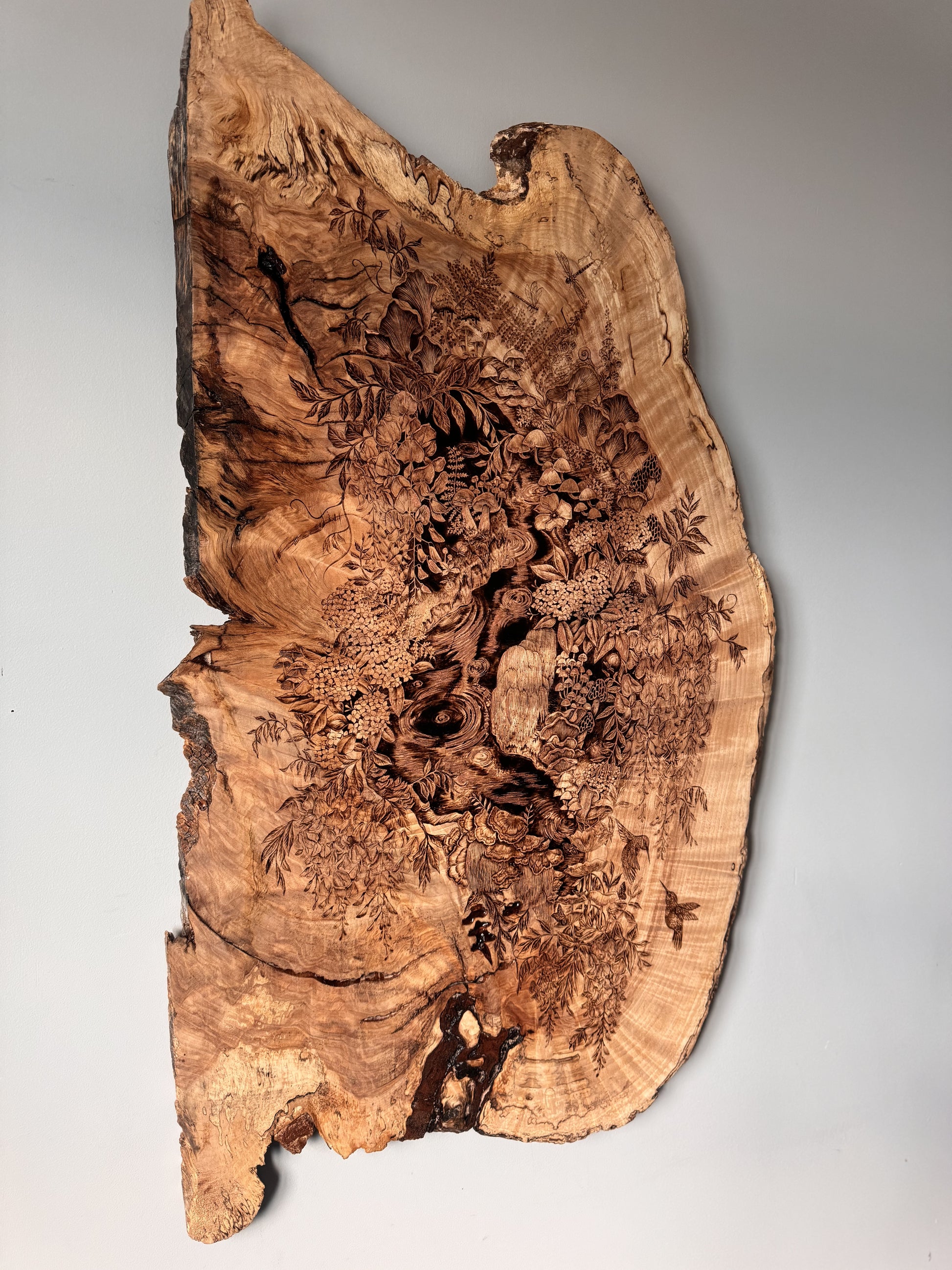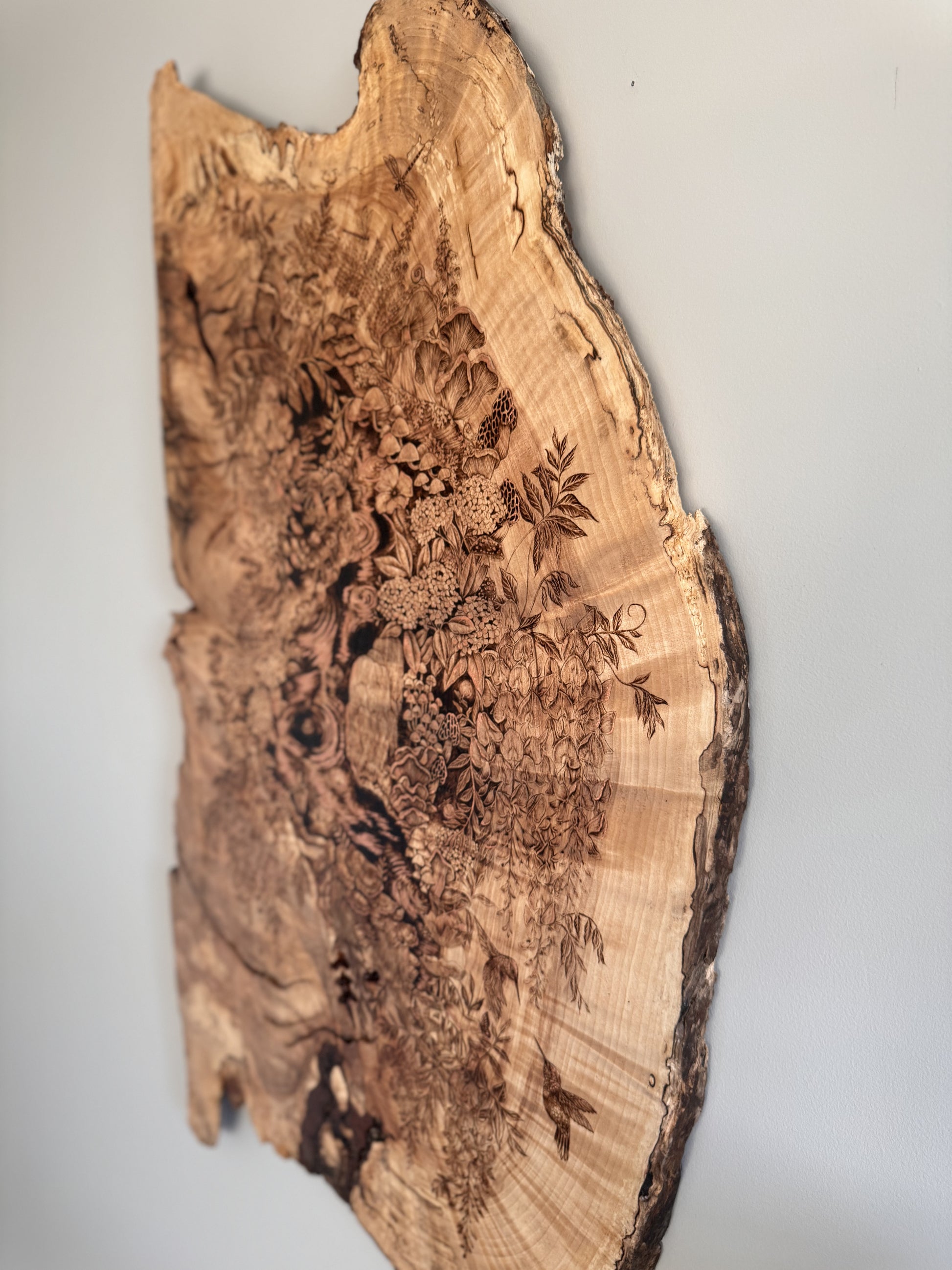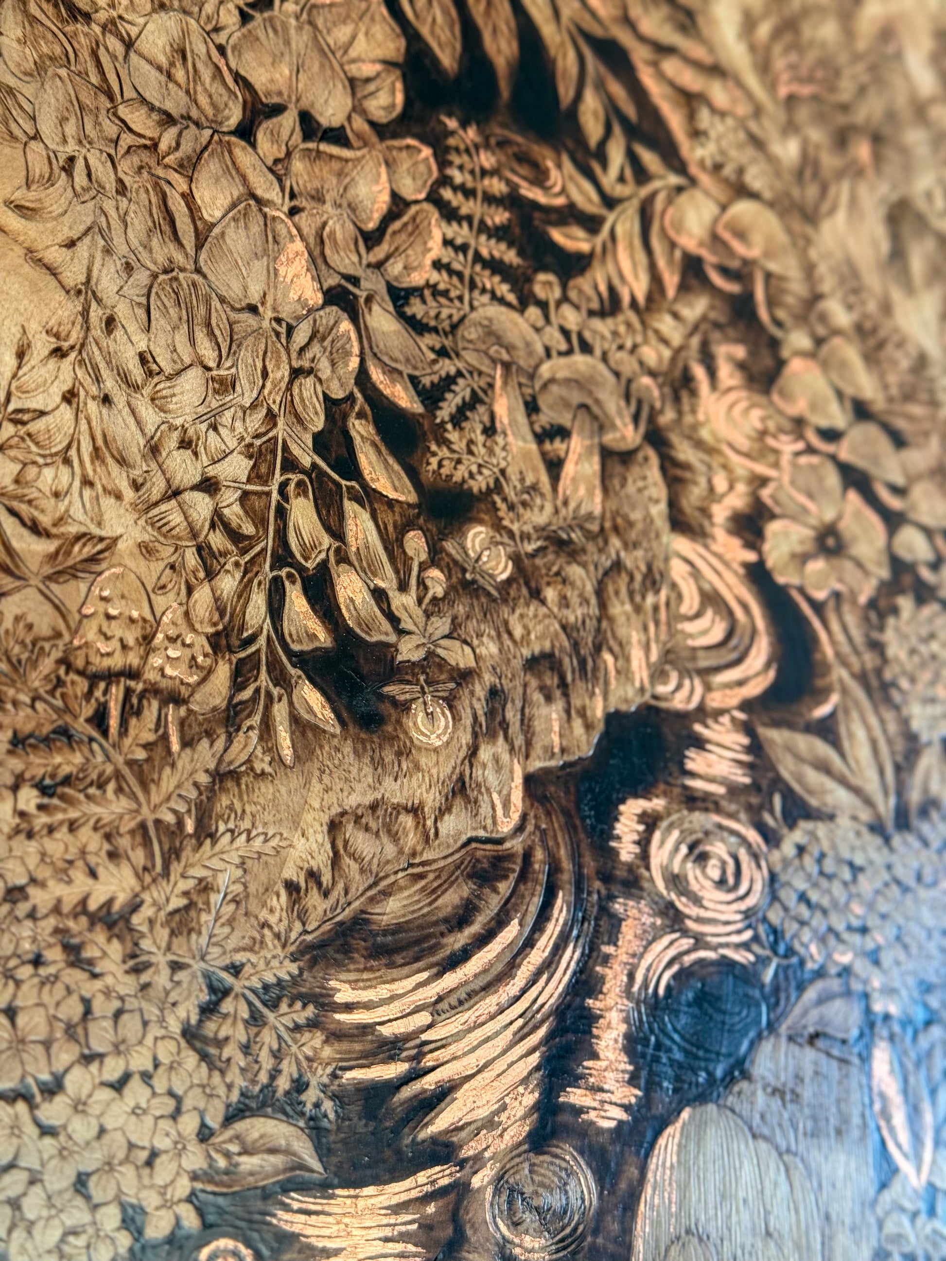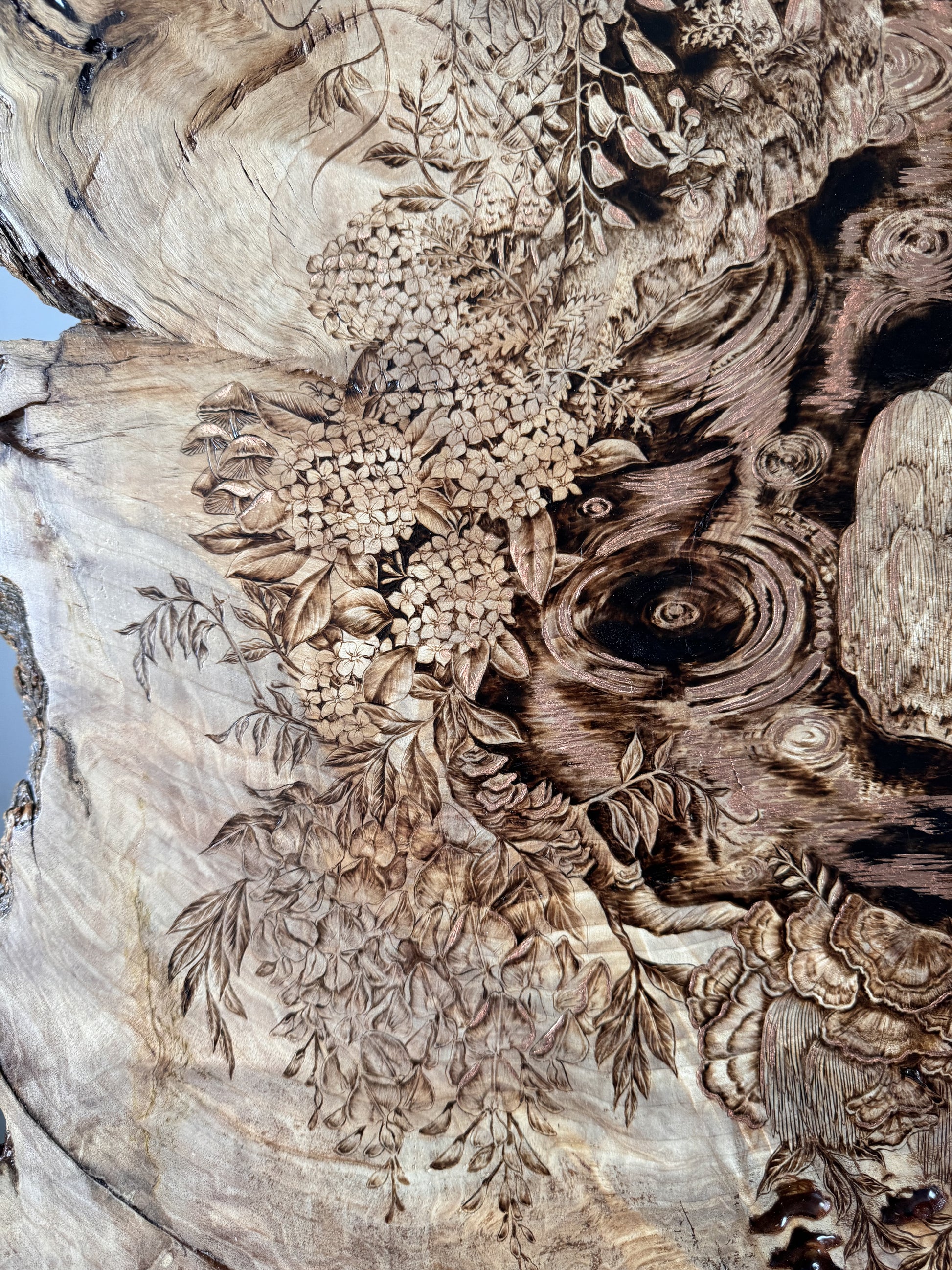 Original burning on a 38.5 x 22.5 inch spalted birch burl, accented with copper leaf.