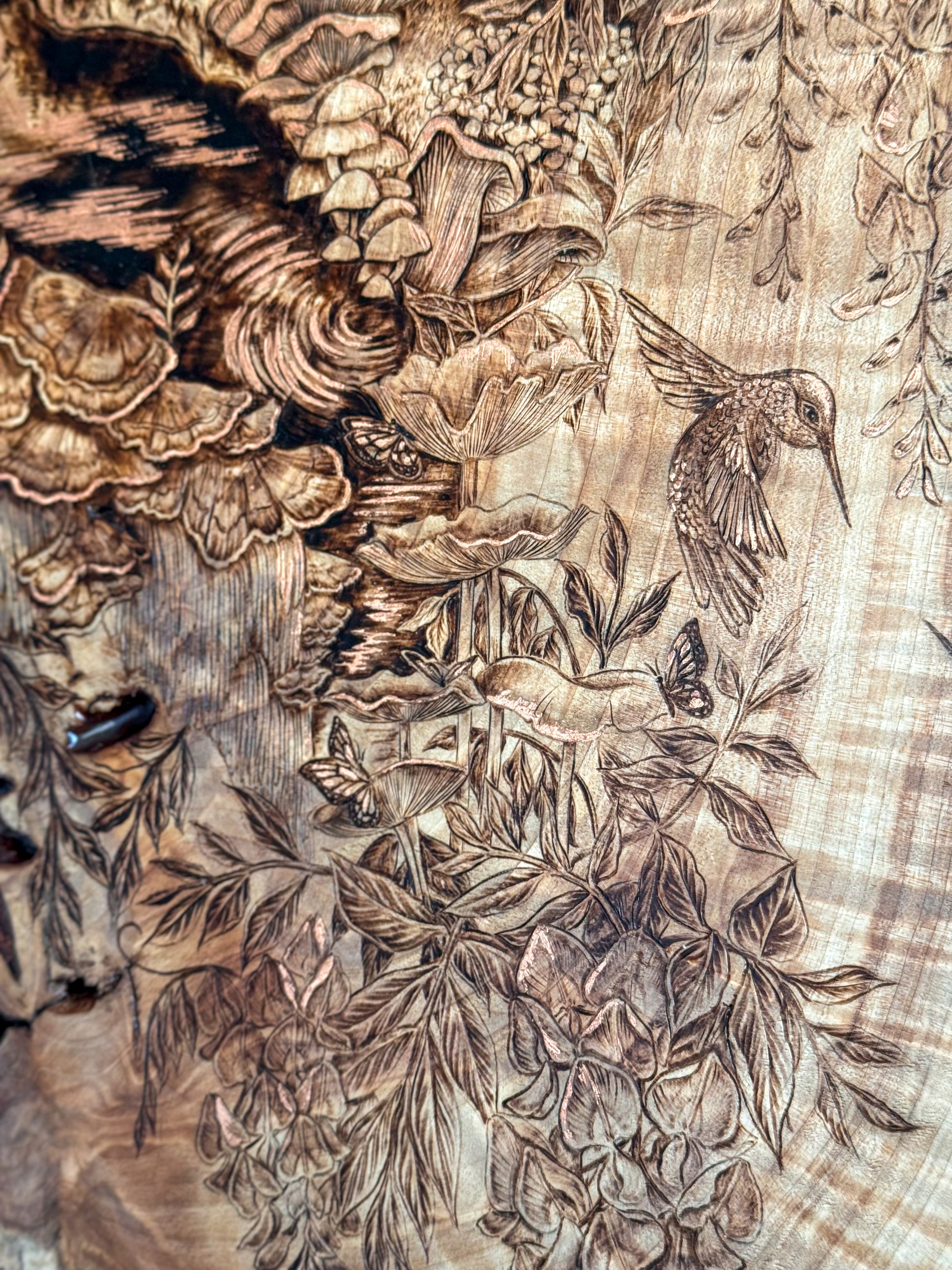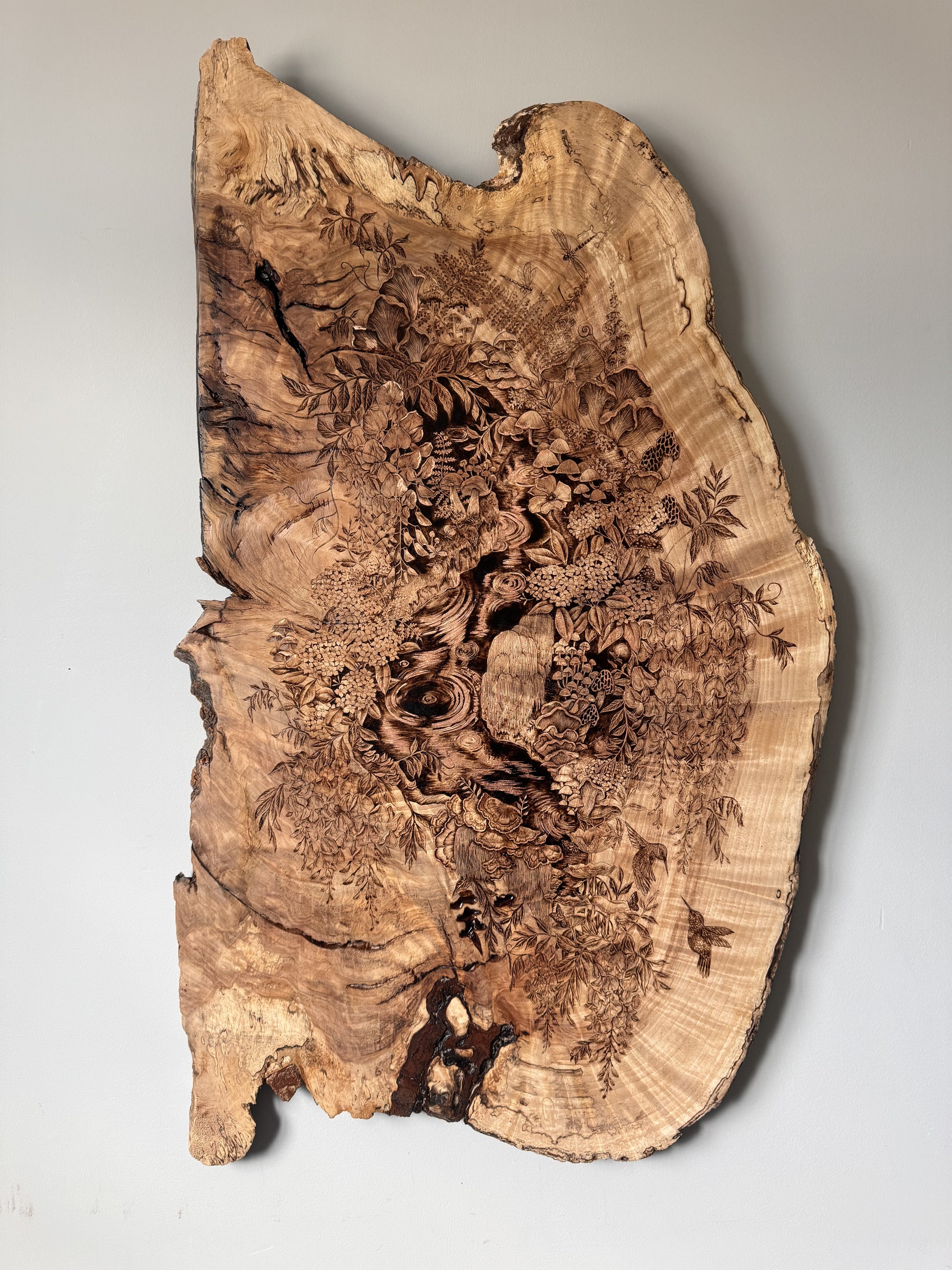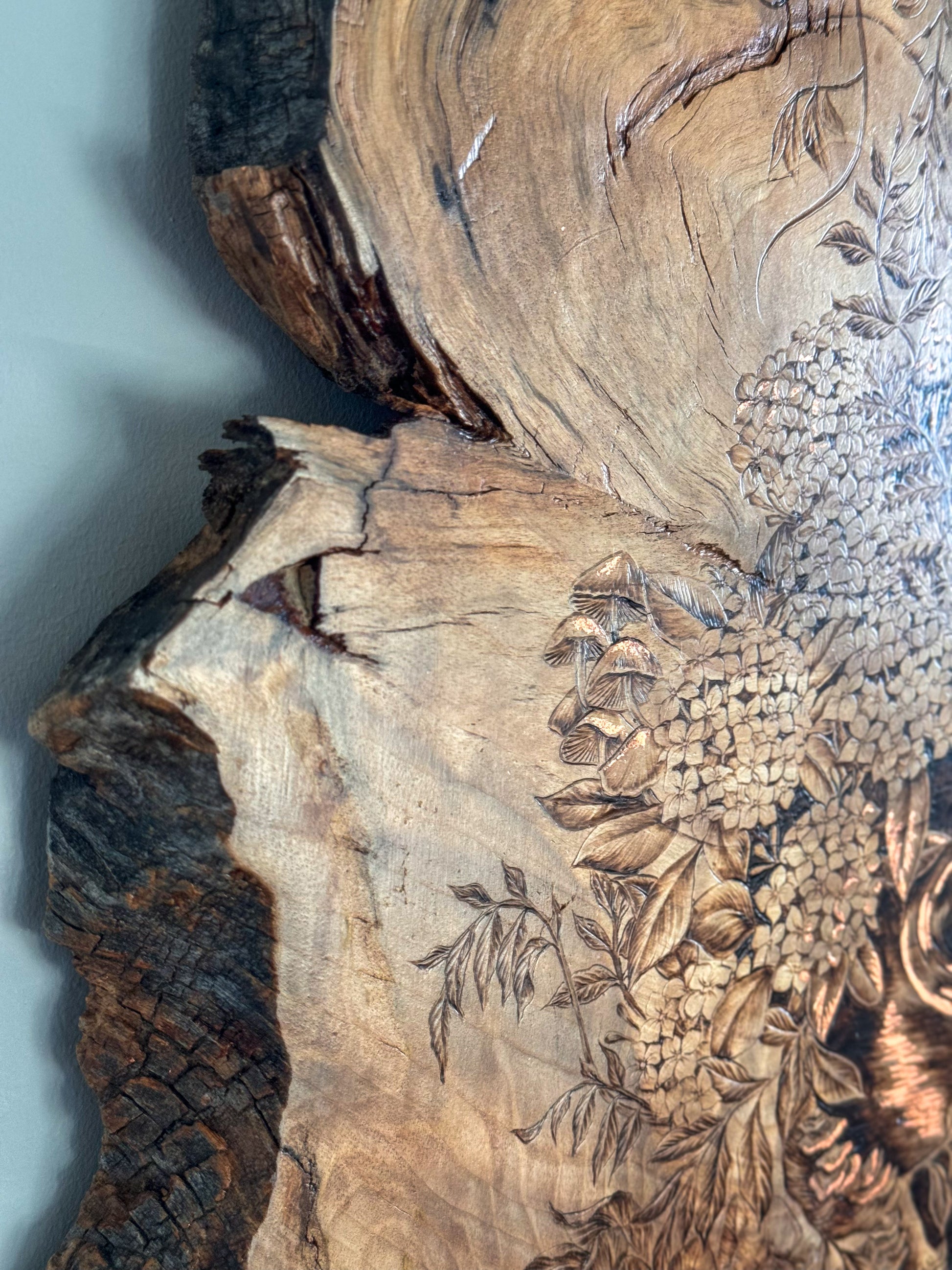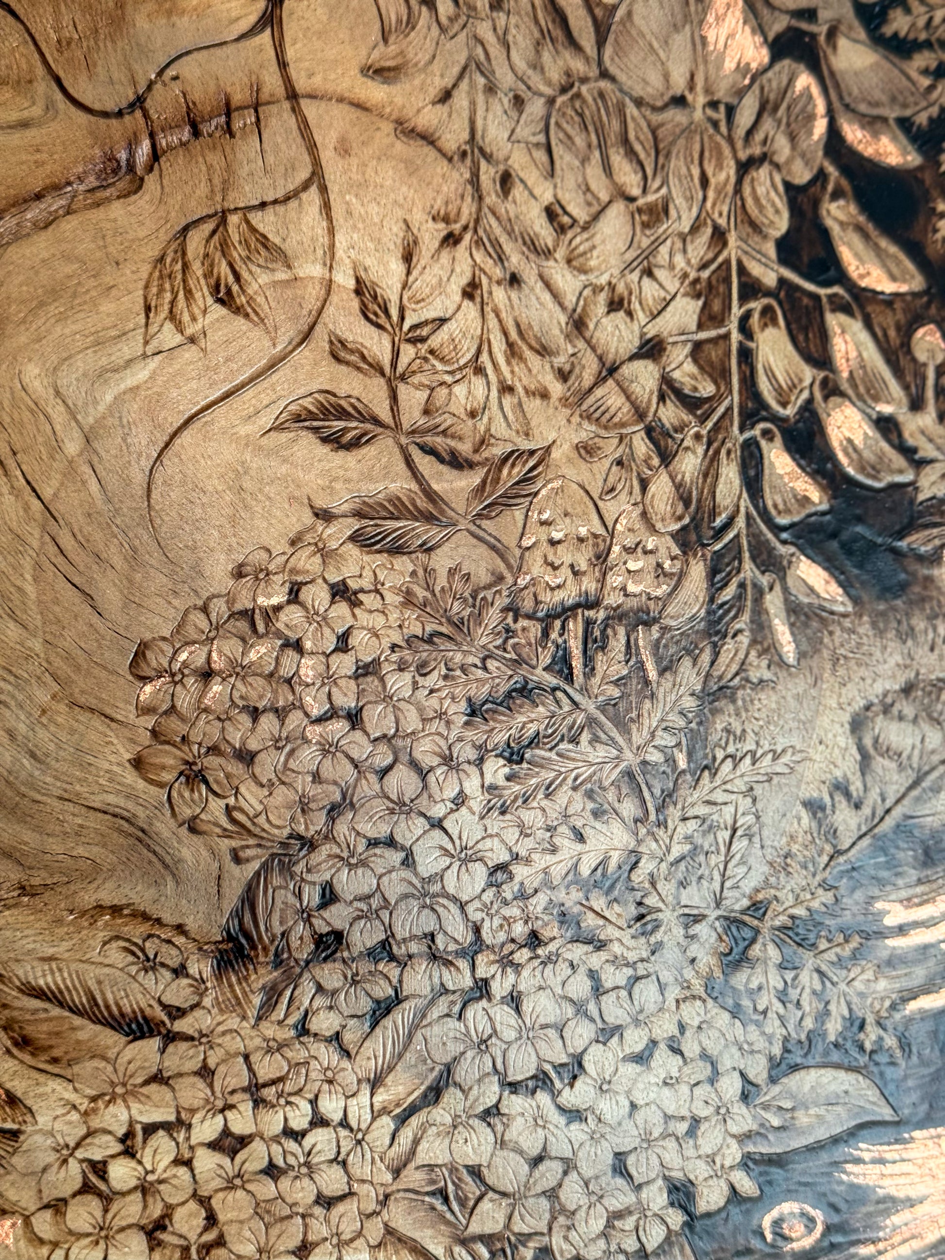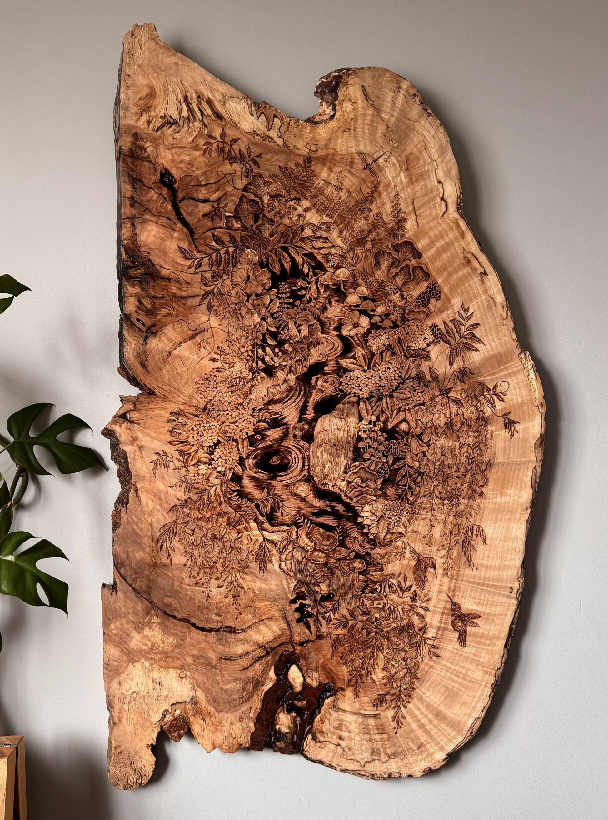 Original burning on a 38.5 x 22.5 inch spalted birch burl, accented with copper leaf.
