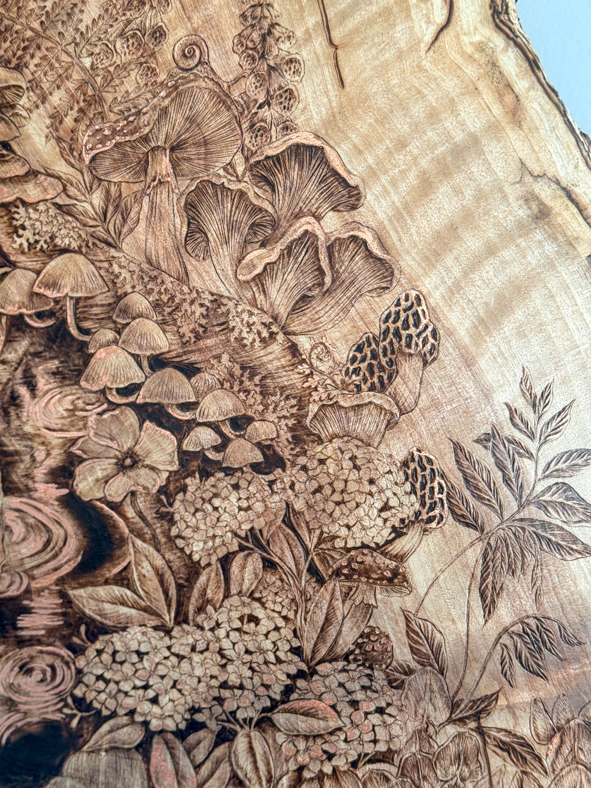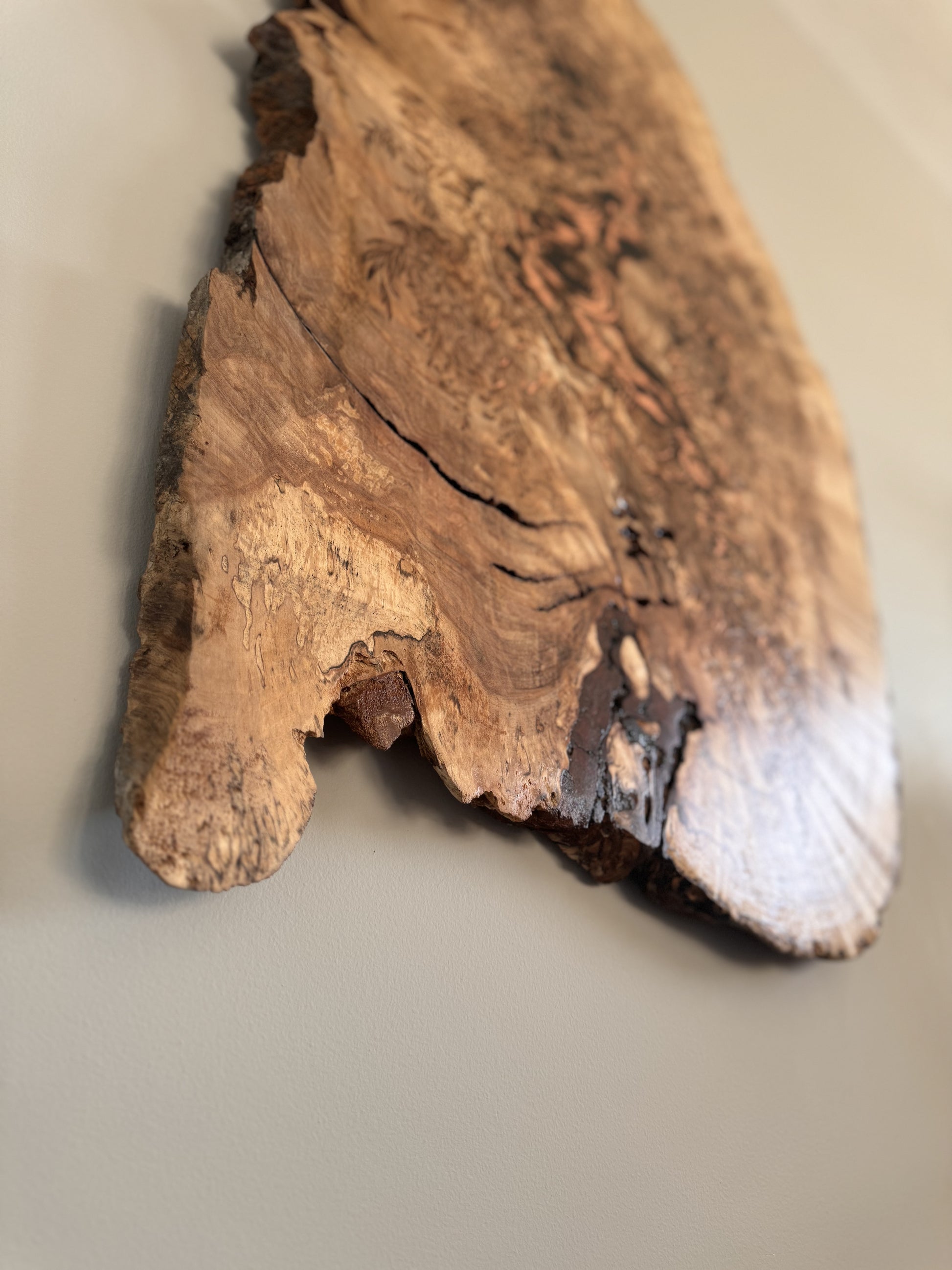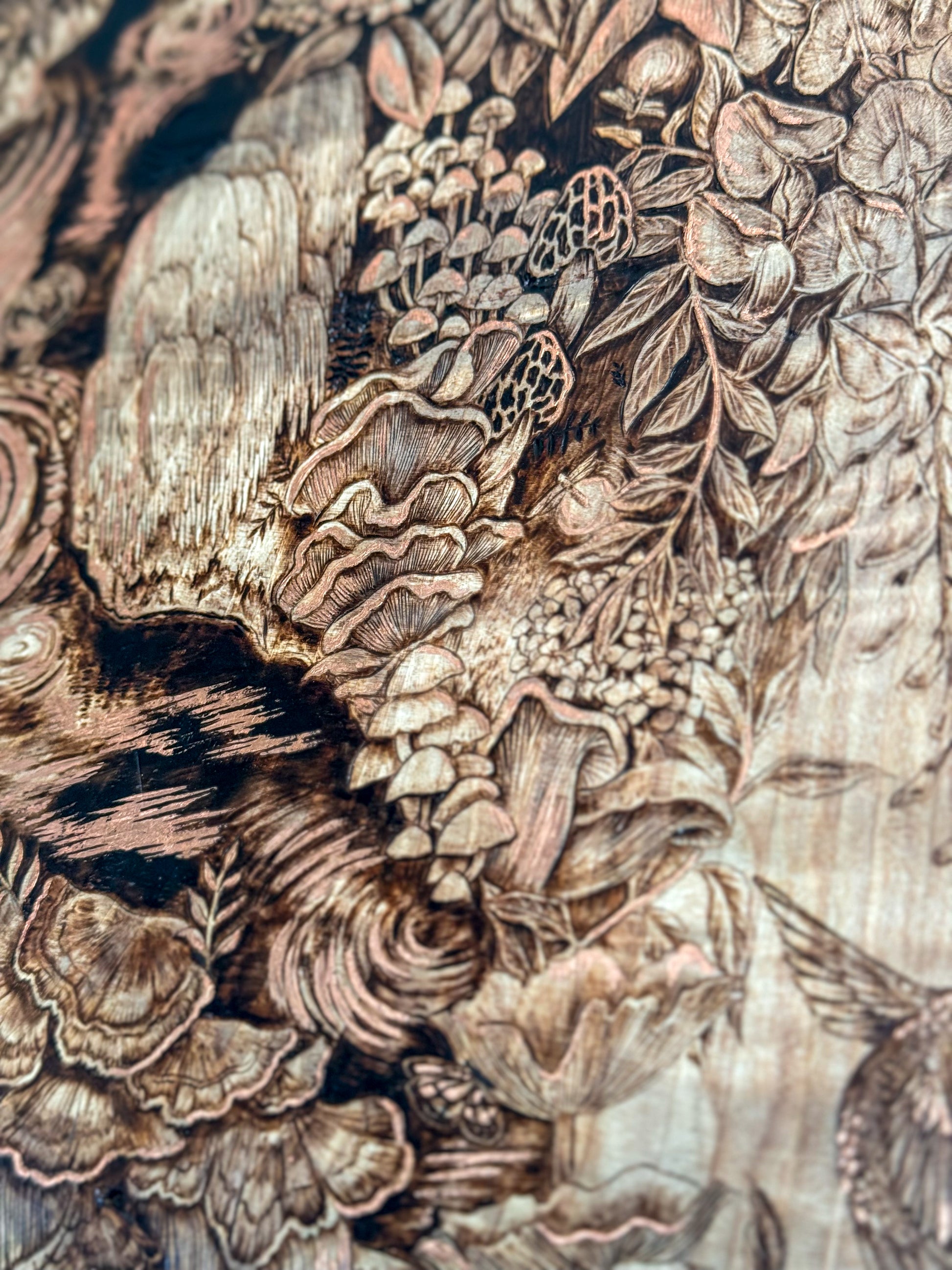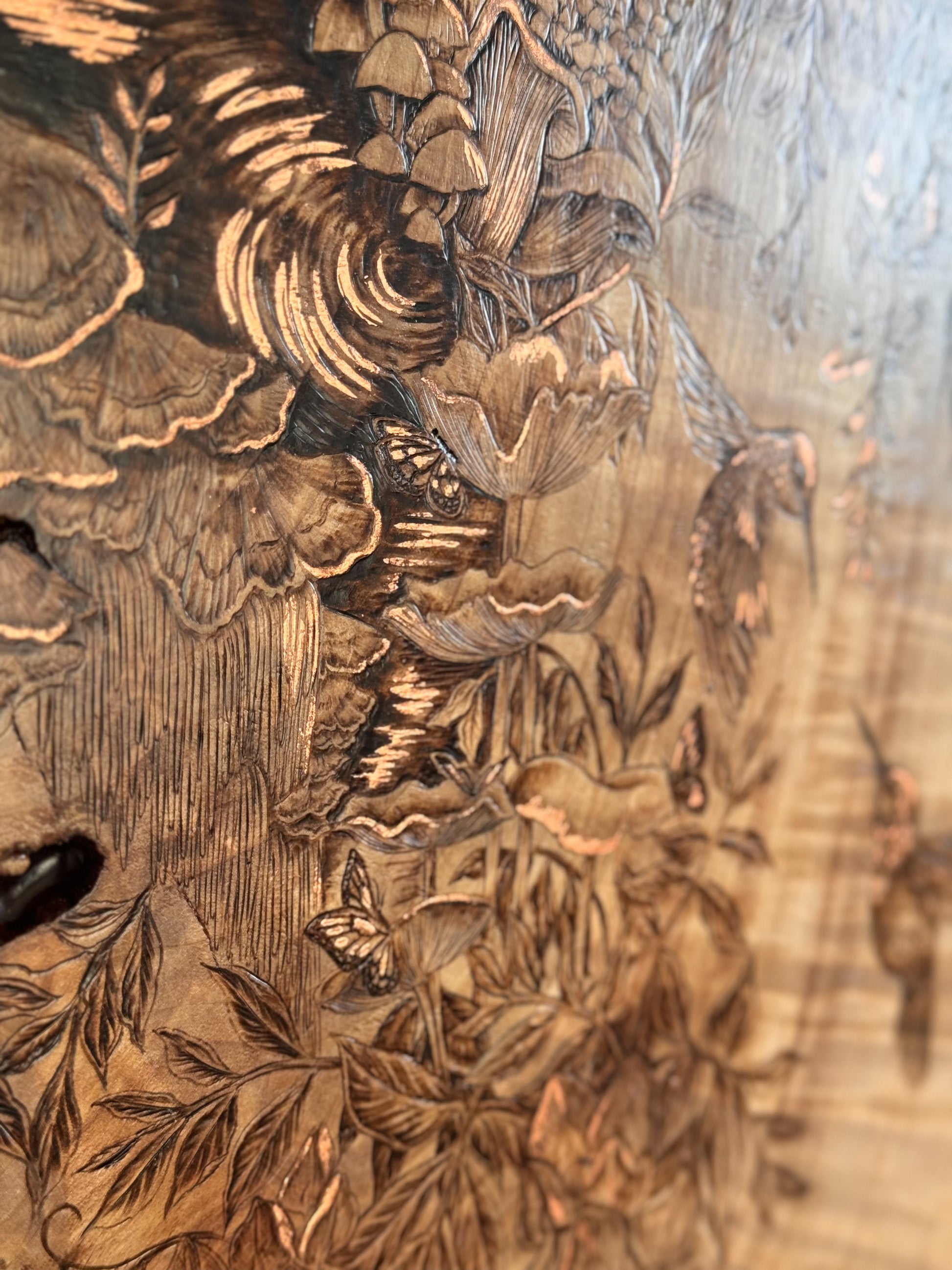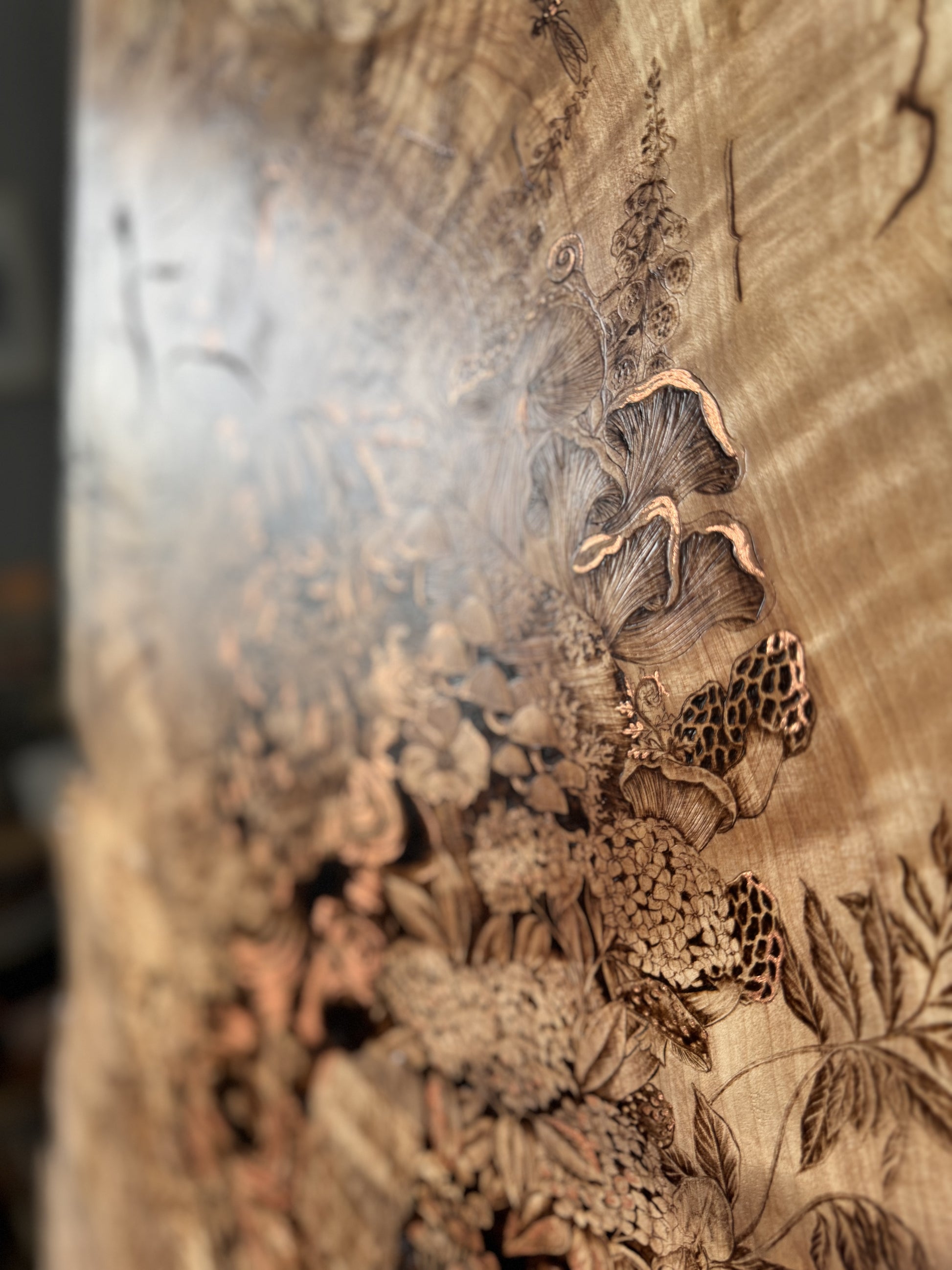 Original burning on a 38.5 x 22.5 inch spalted birch burl, accented with copper leaf.