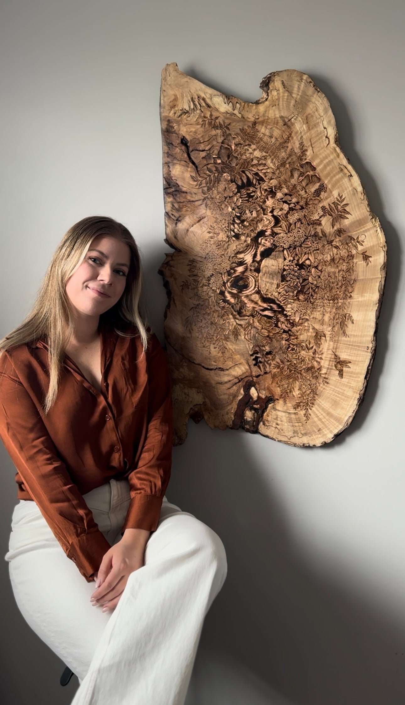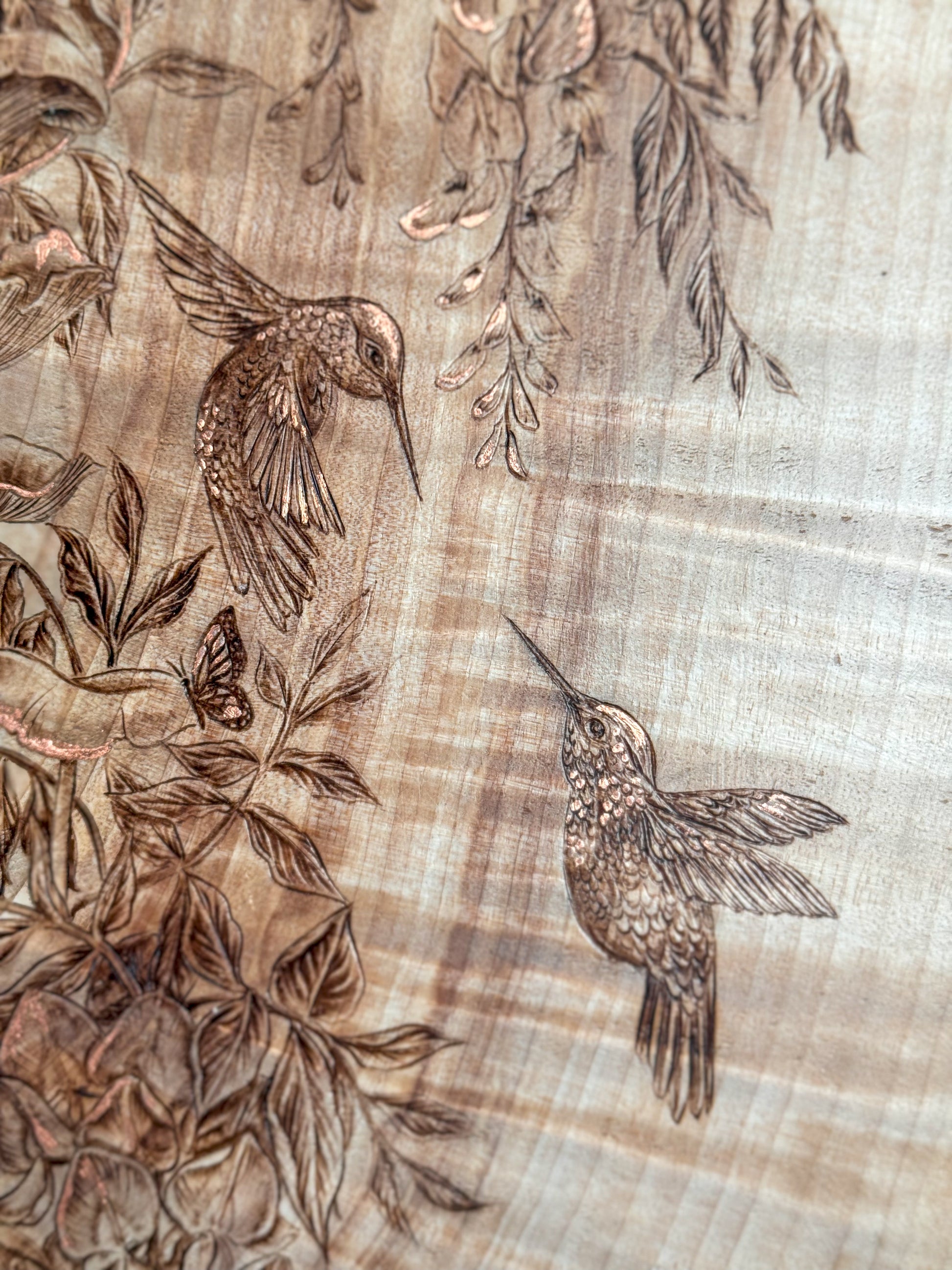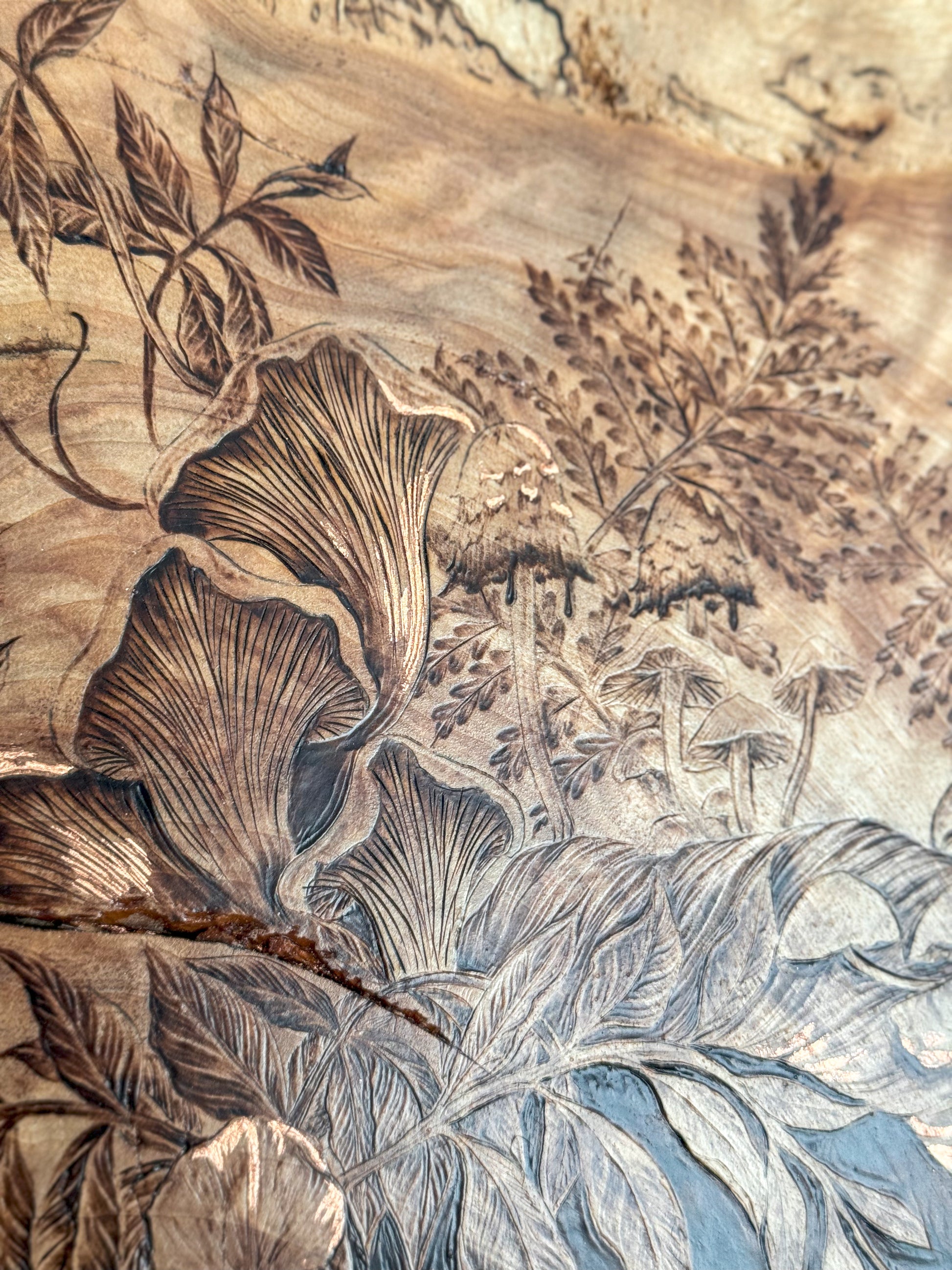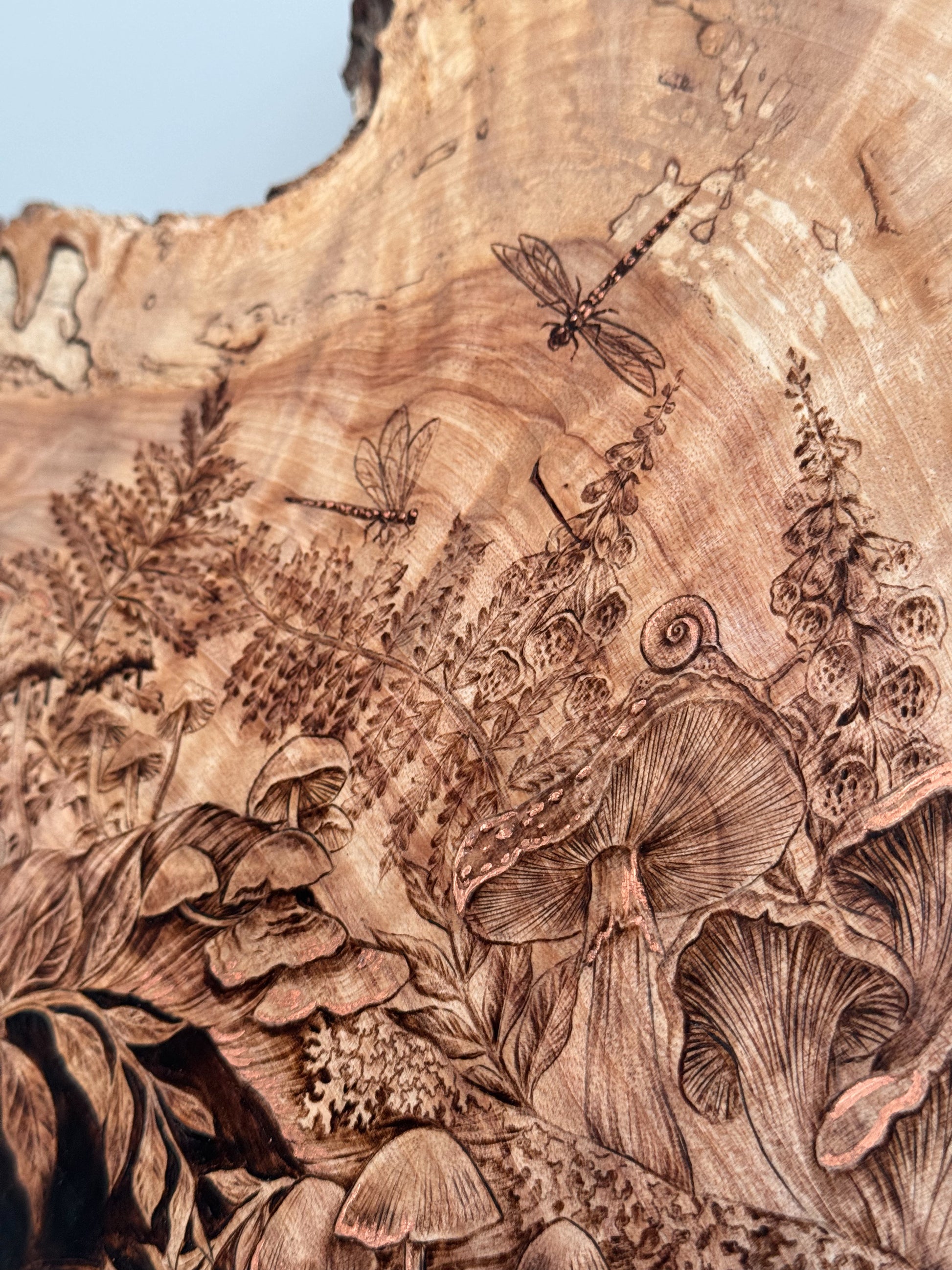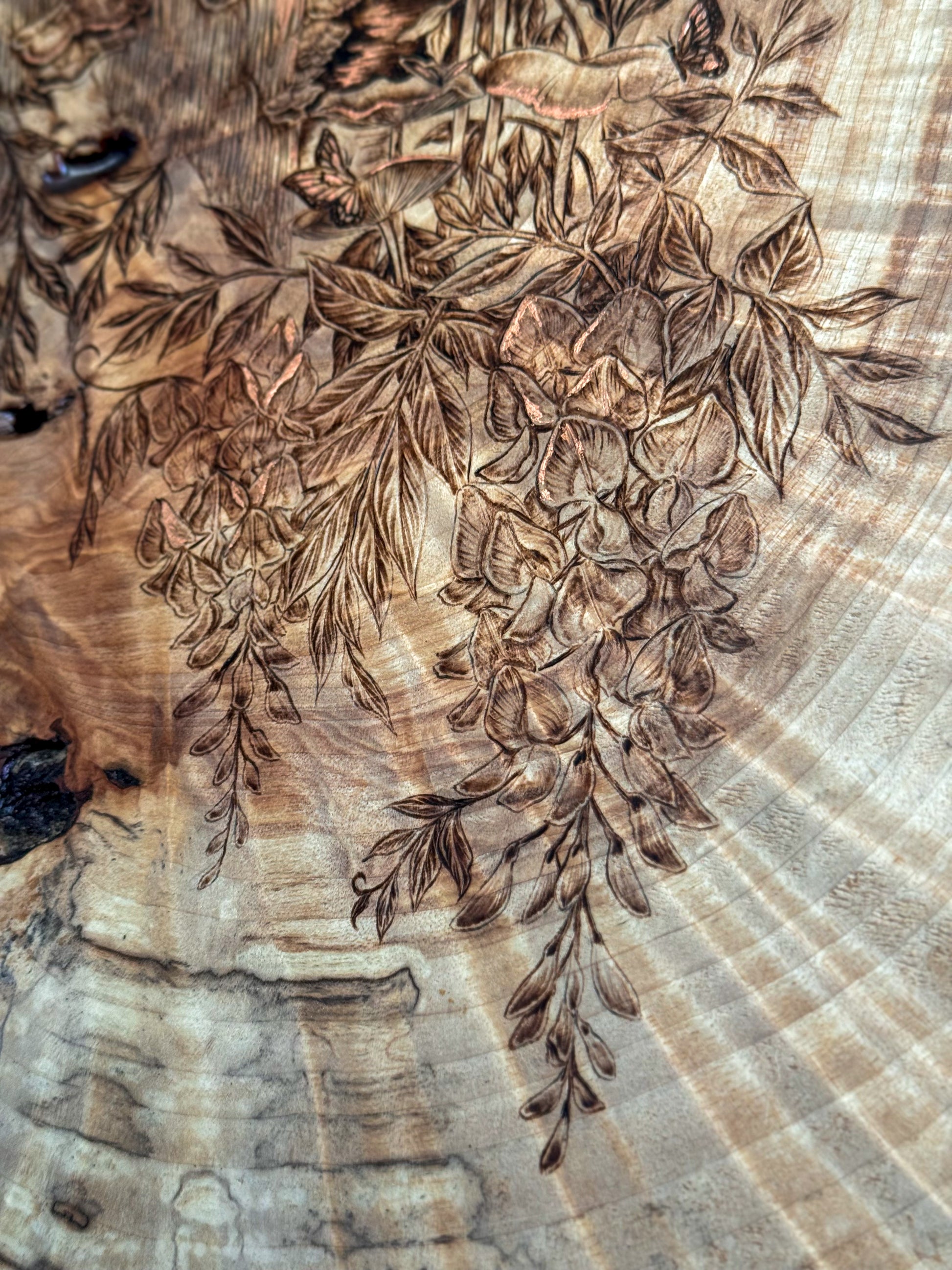 Original burning on a 38.5 x 22.5 inch spalted birch burl, accented with copper leaf.