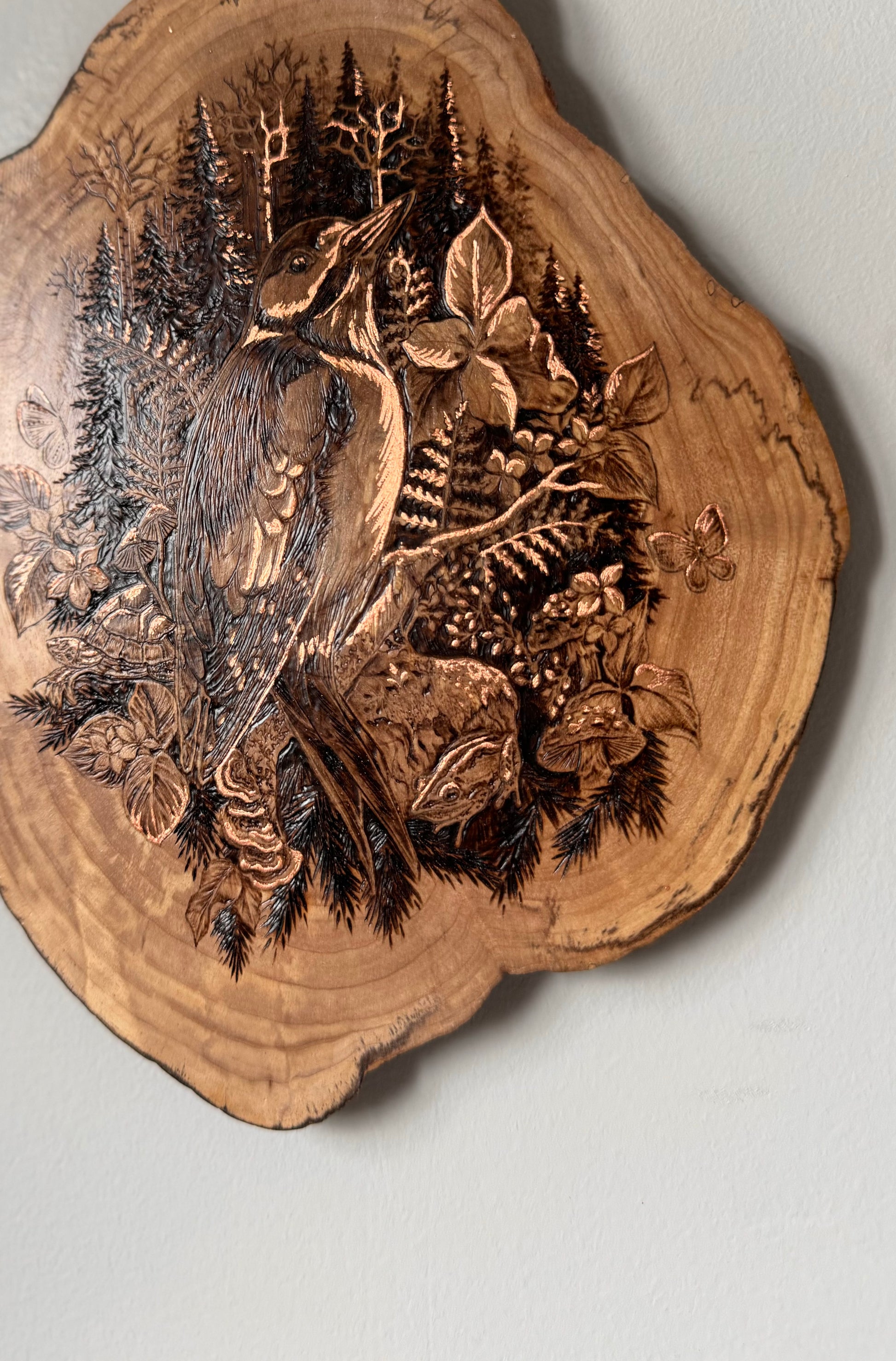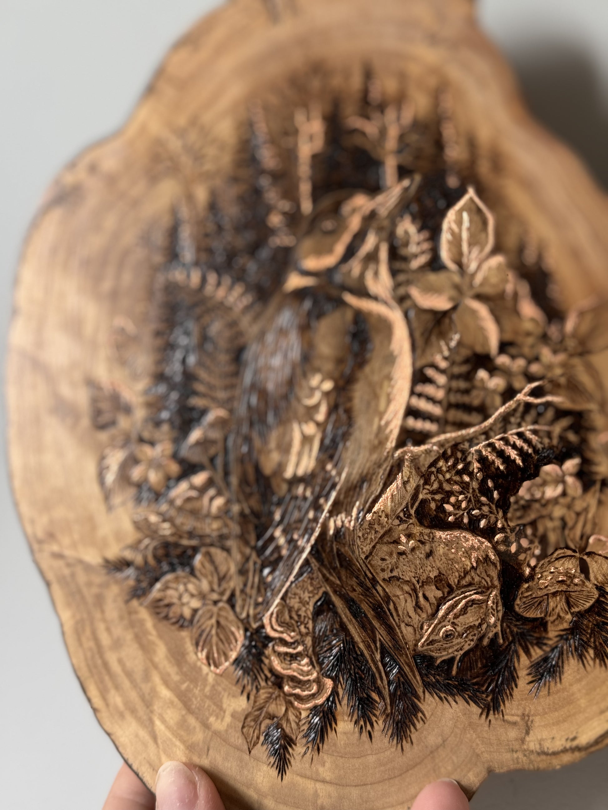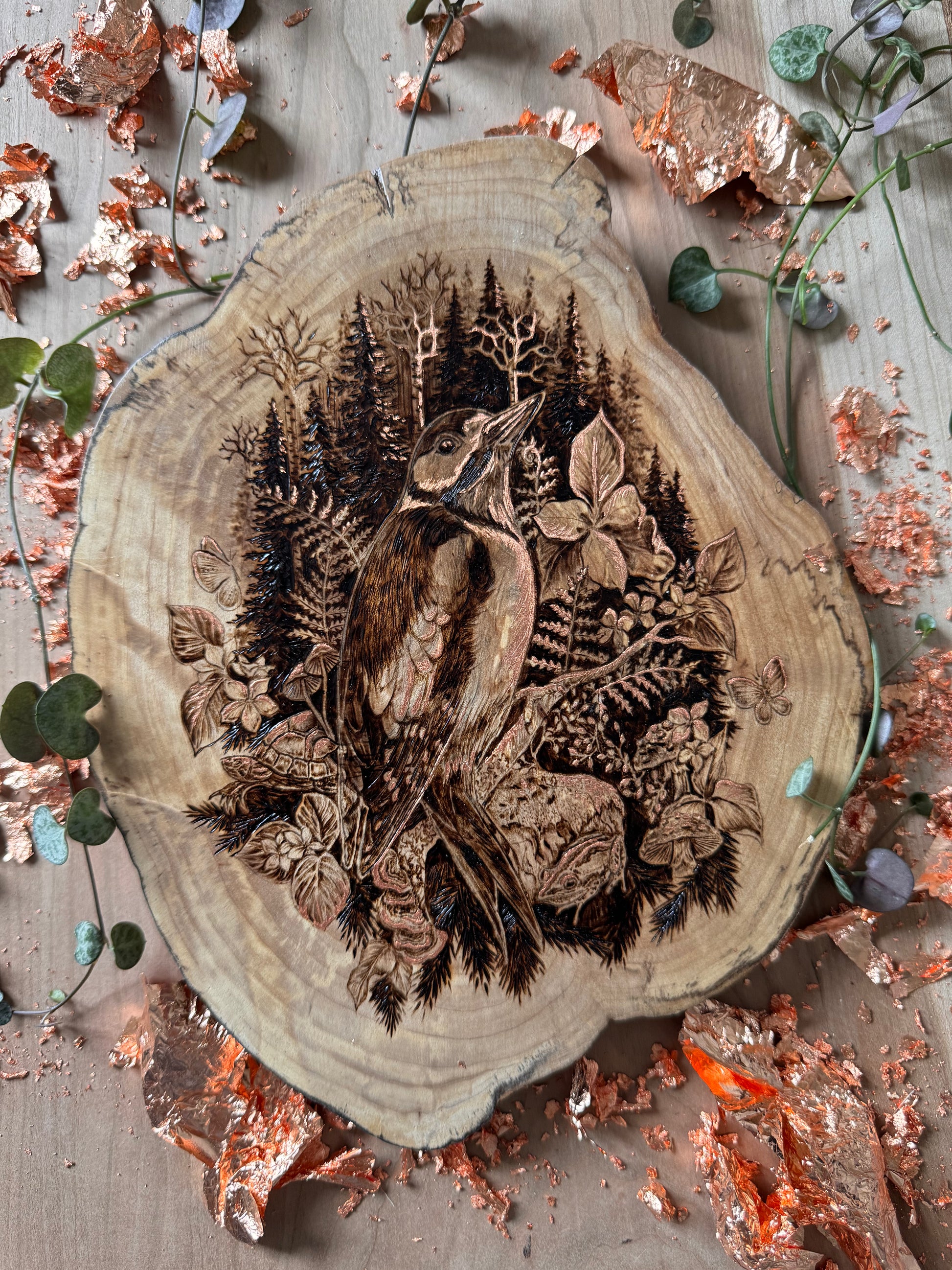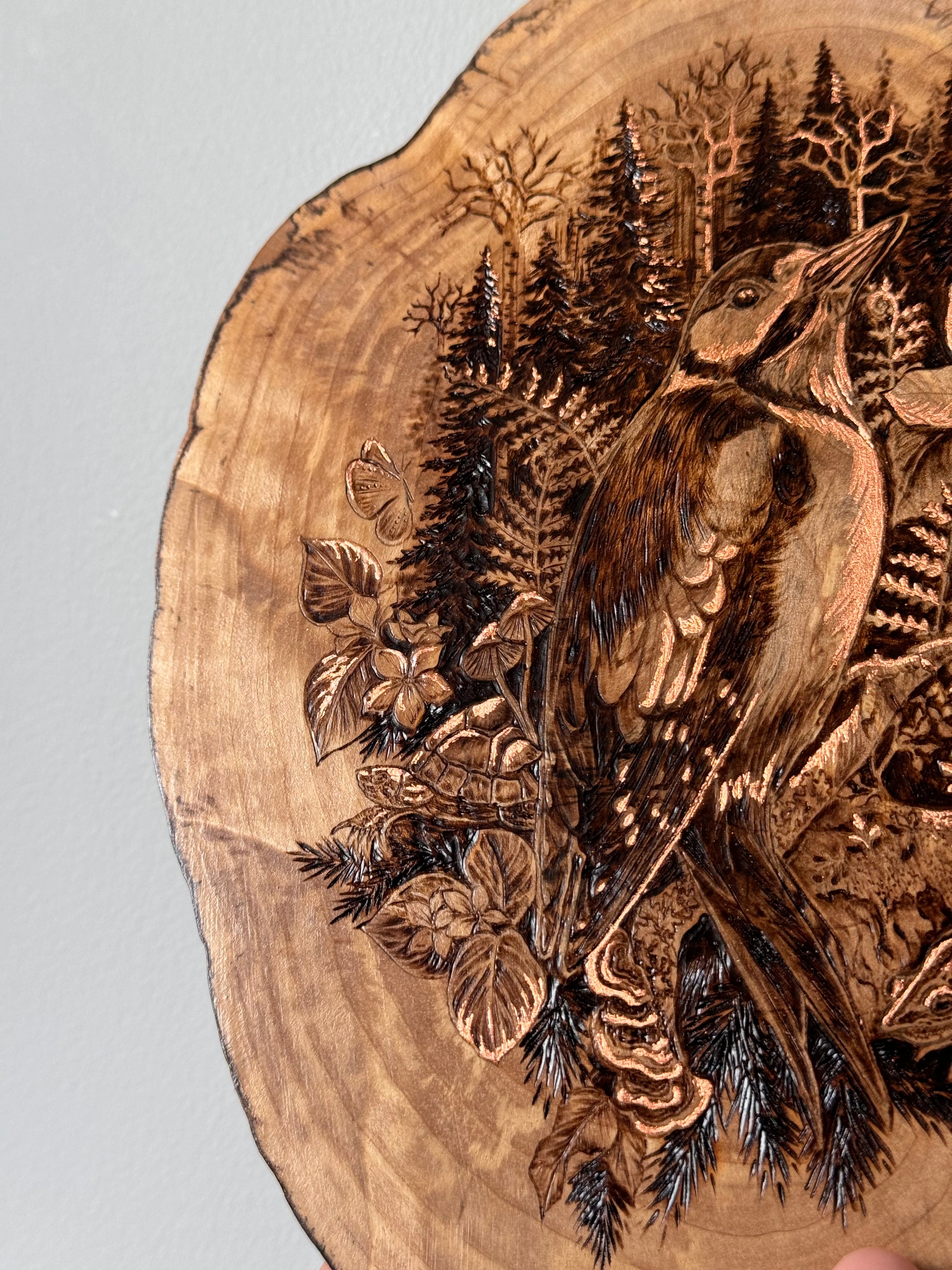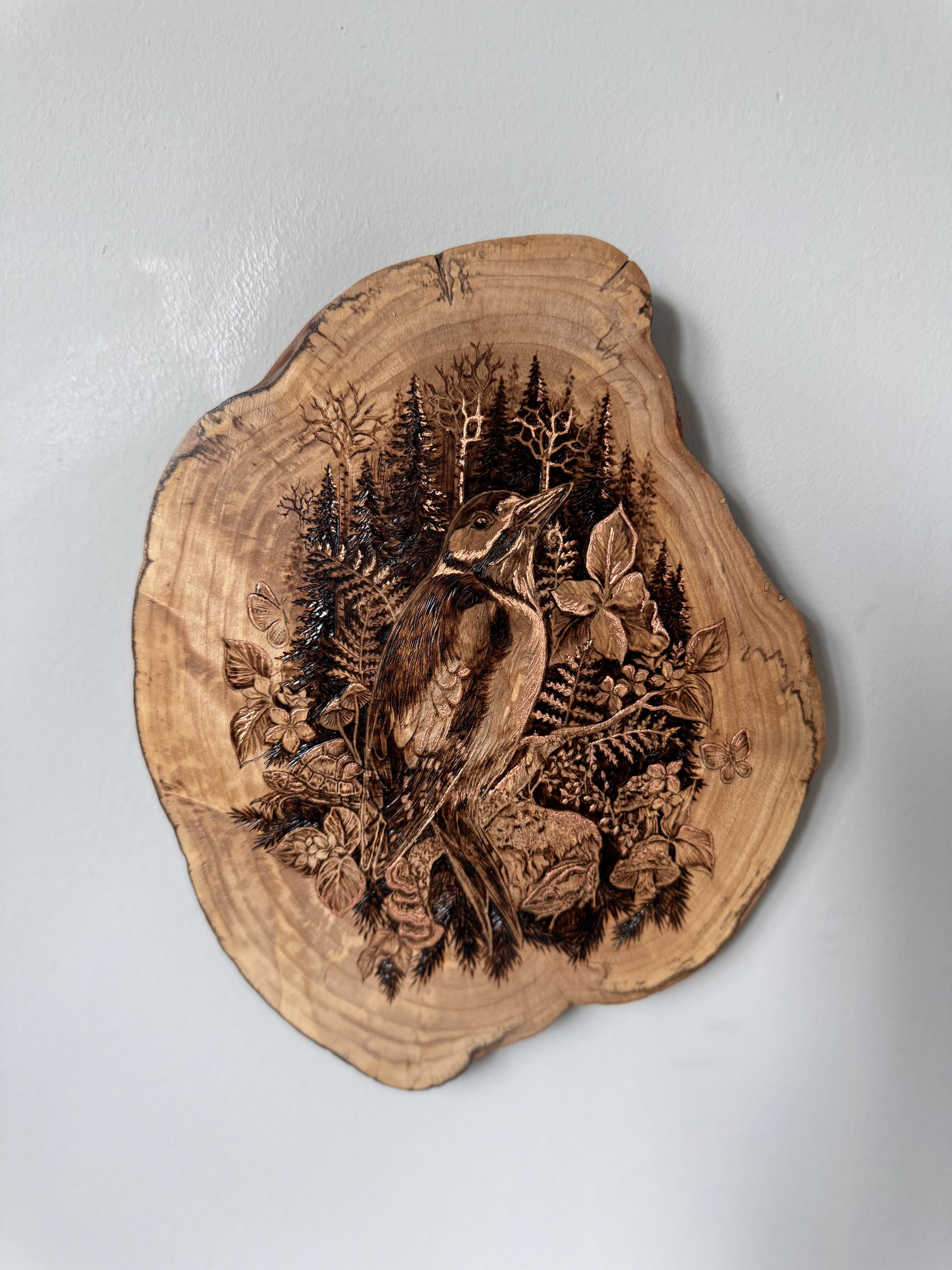 An original wood burning on 8.75 x 7 x .5 Inch spalted birch