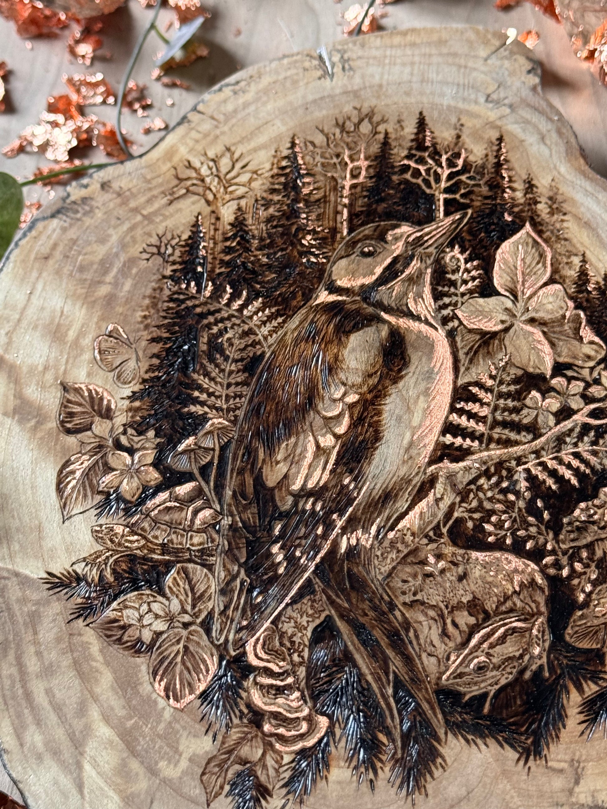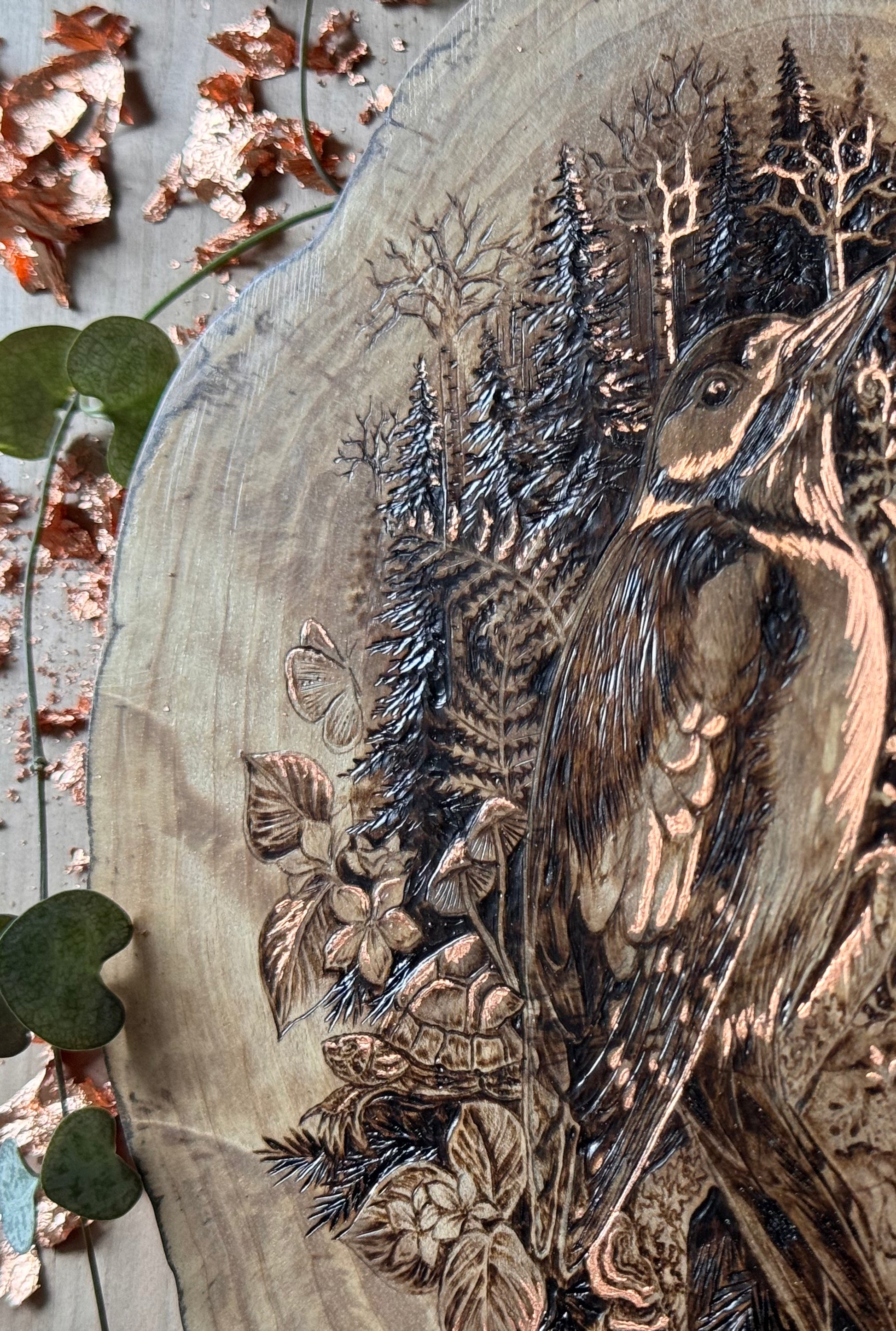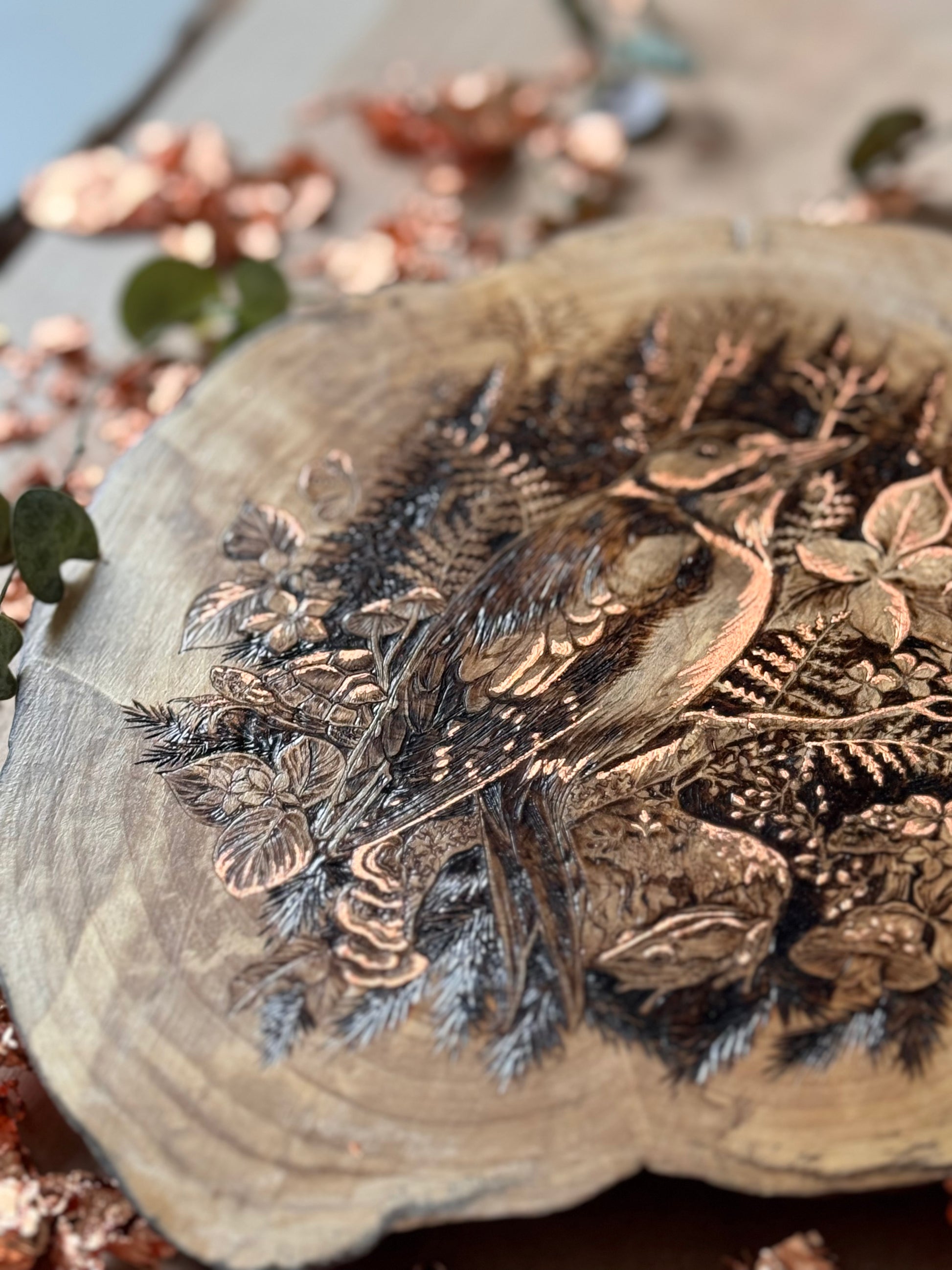 Inspired by a magical visit to Haliburton, Ontario, Hannah has used her surroundings as imagery. Within the details of this piece you will find a wood pecker, a painted turtle, a boreal chorus frog and whimsical moths amid a woodland setting, accented with copper leaf to capture golden hour sneaking its way between the forest foliage.