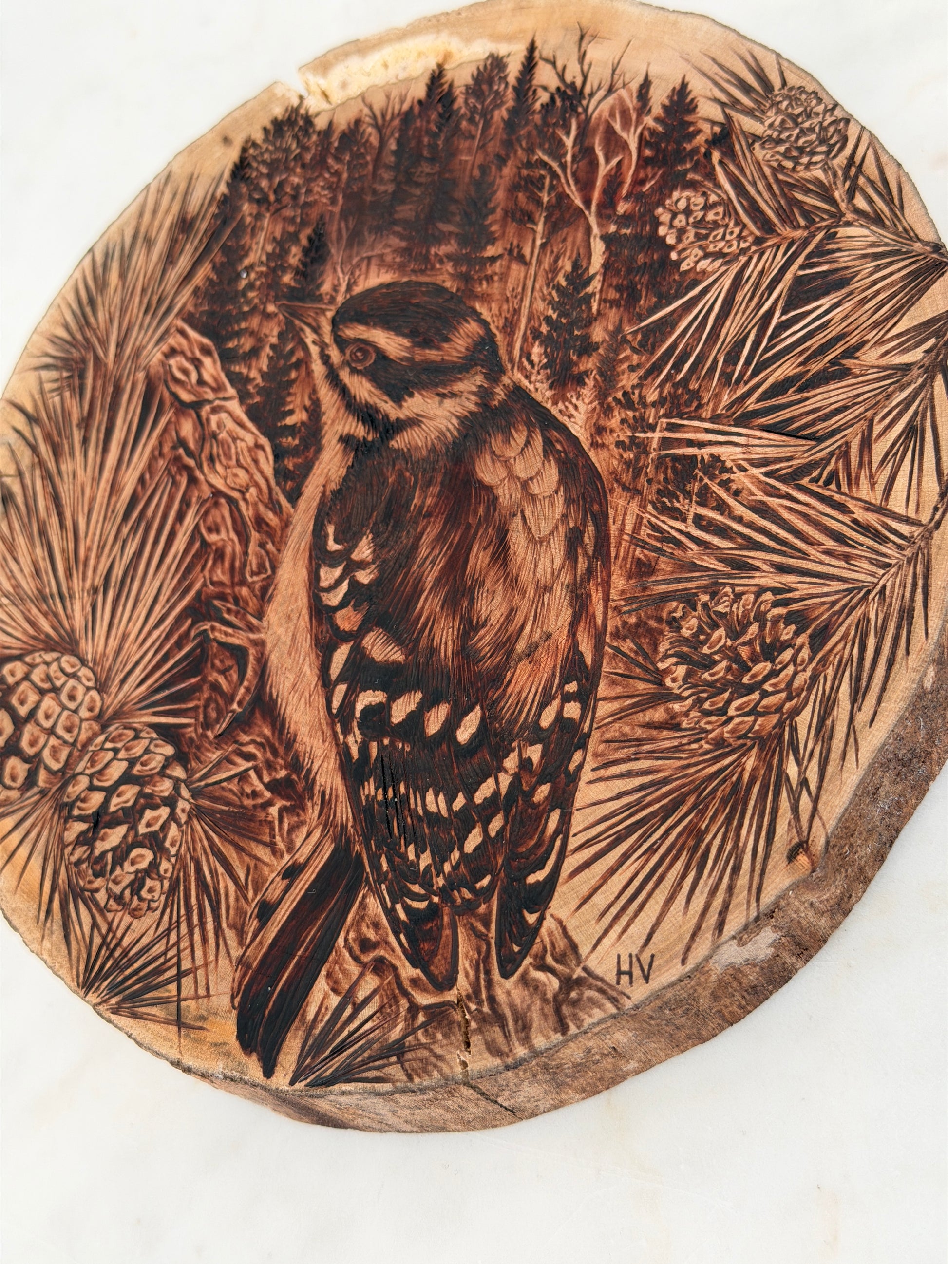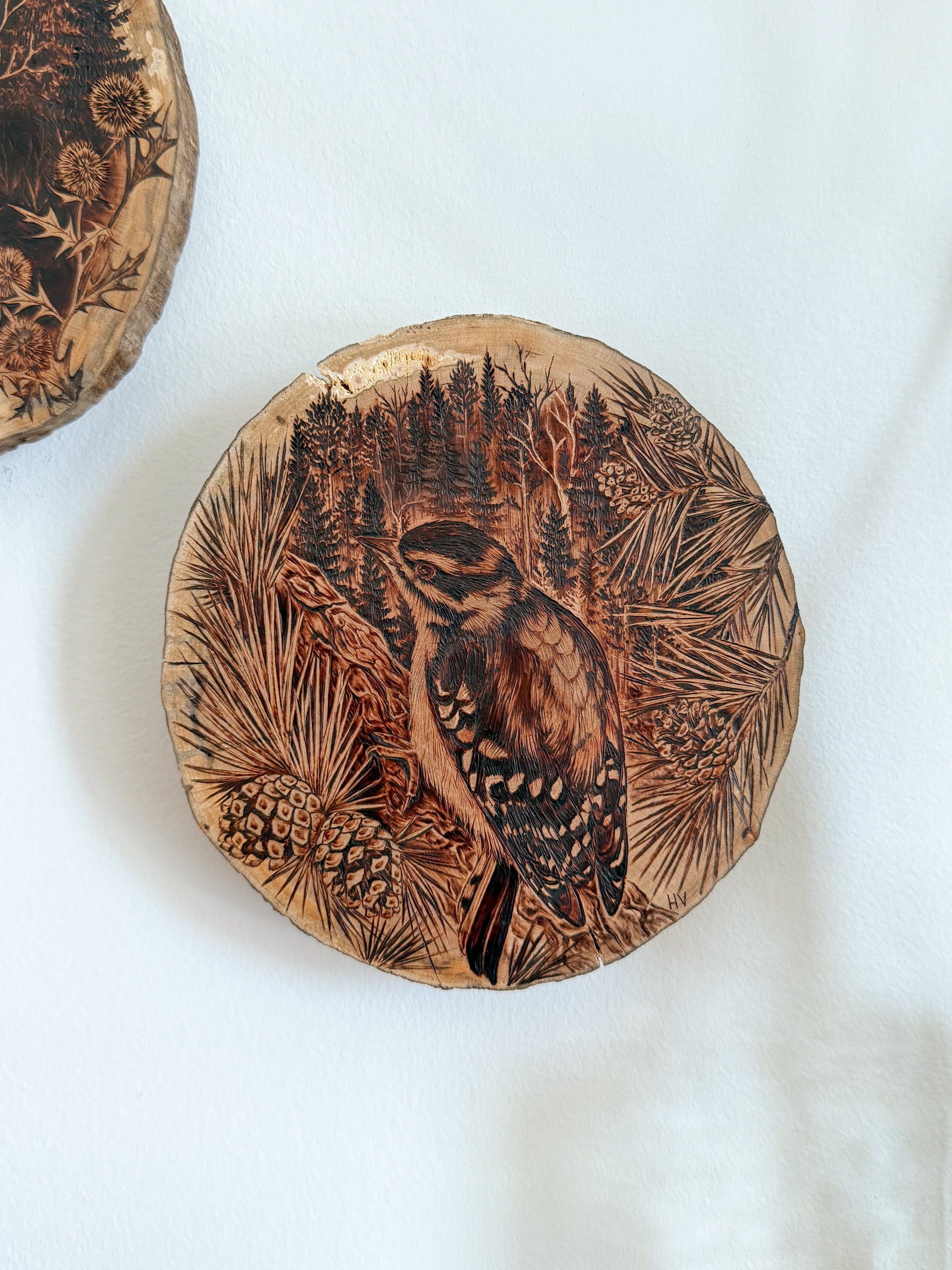 All original and custom art is diligently designed, drawn and hand-burned by pyrography artist Hannah Veiga. She has spent years honing her skills as an artist and practicing the techniques she uses today to render distinctive compositions inspired by the nature that surrounds us, giving sustainably sourced wood a second life as unique works of art.