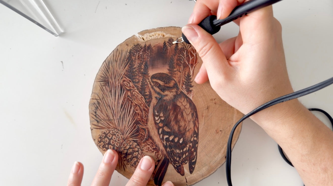 Each piece of wood is cut and sanded by Hannah up to a super smooth 320 grit to create the perfectly primed surface for burning. Using a state of the art wood burning system, the artist yields heat-controlled metal tips to manipulate burn marks into an intricate, hand-drawn design.