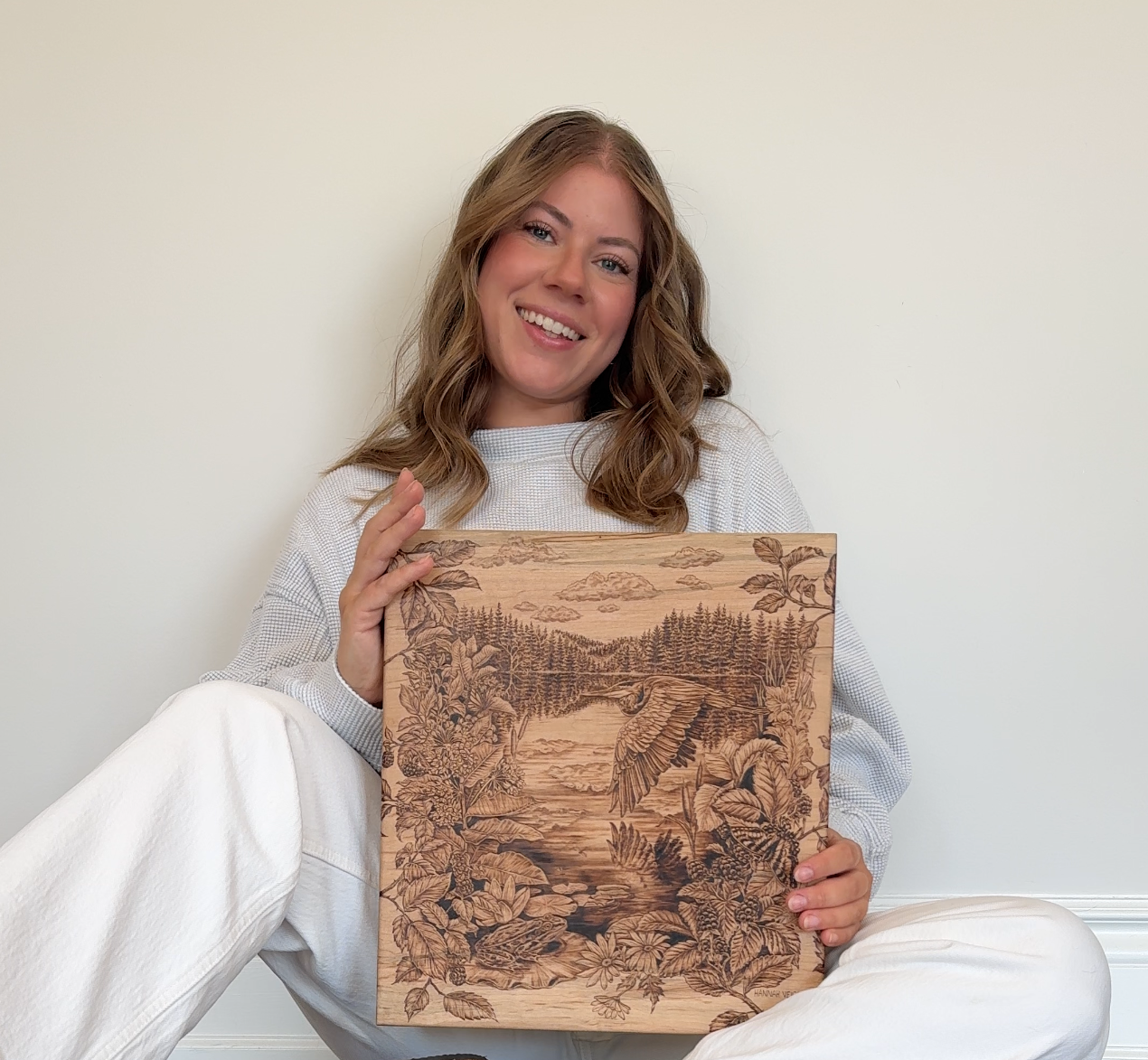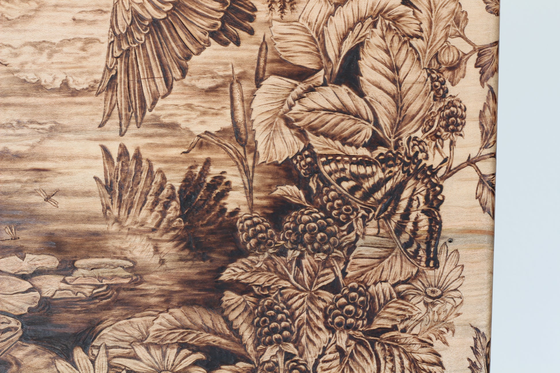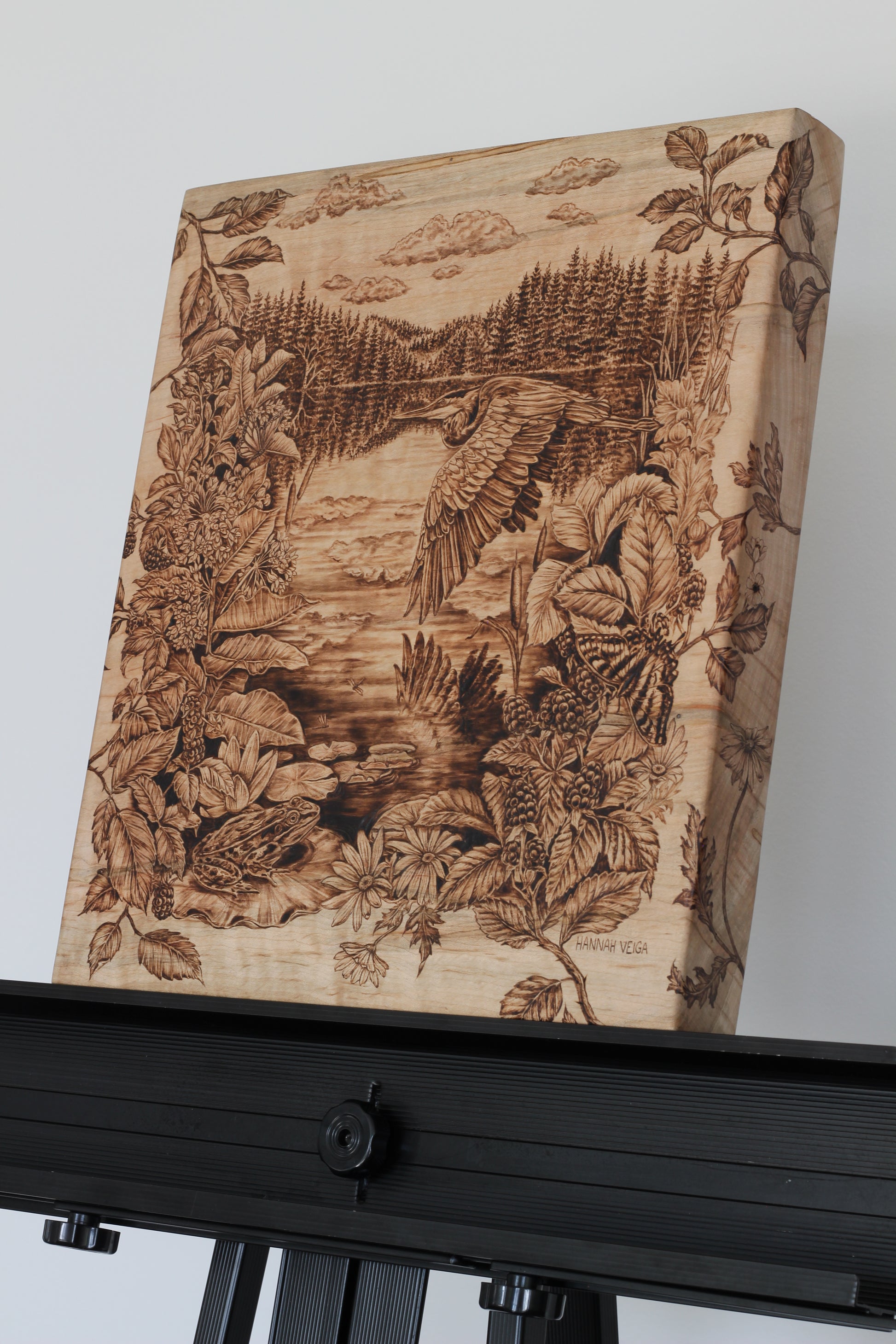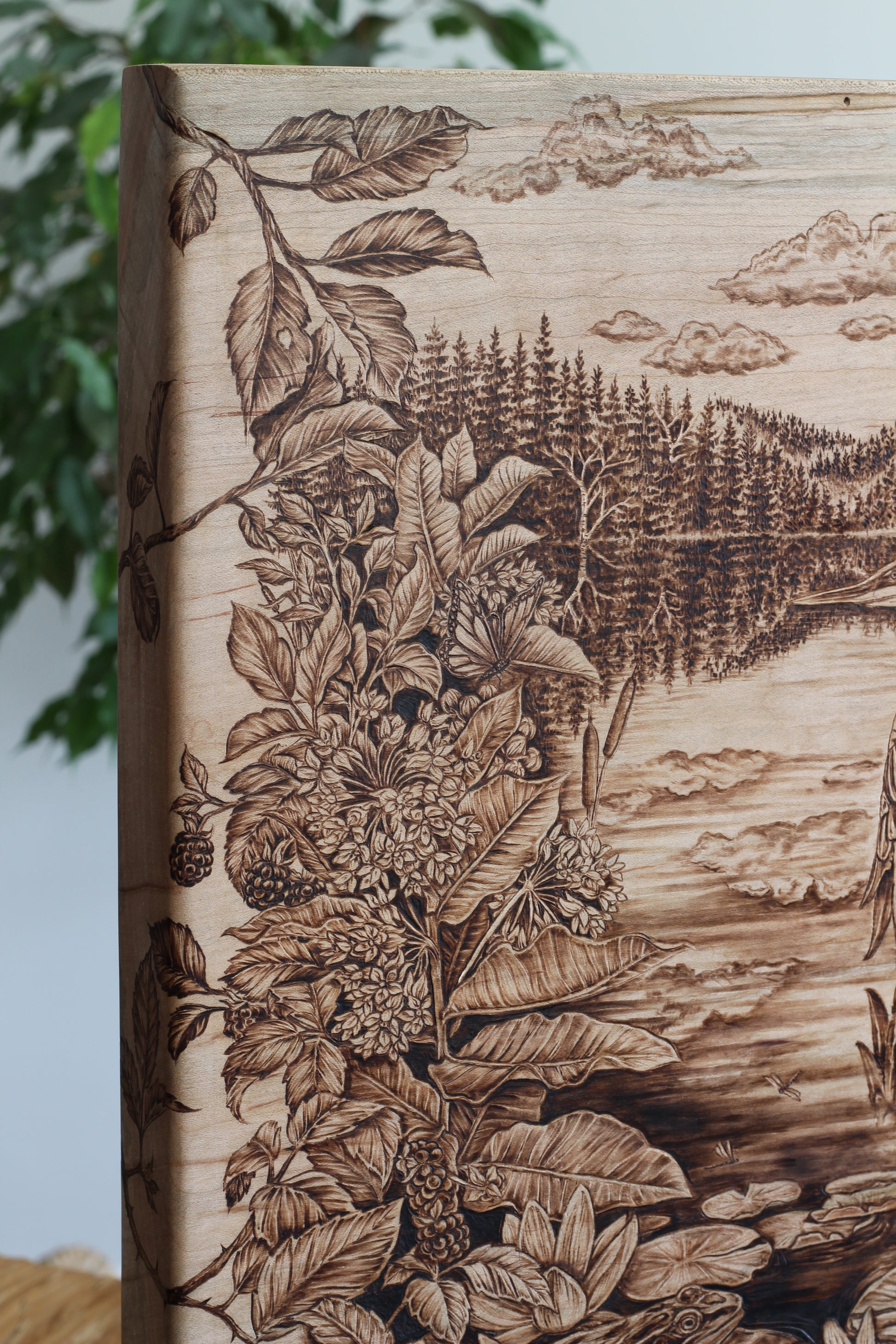 This hand-designed, hand-burned original artwork embraces all the familiar moments found in nature nearing the end of summer. Inspired by my findings during many evenings spent paddling on the lake, this woodburning reminisces on the memories of dragonflies dancing across blooming lily pads, a forage of berries, and the swoop of a heron’s wing across the water that halted my breath. In both the stillness and the life that is held in these moments, on an exhale, we can know all will be okay.