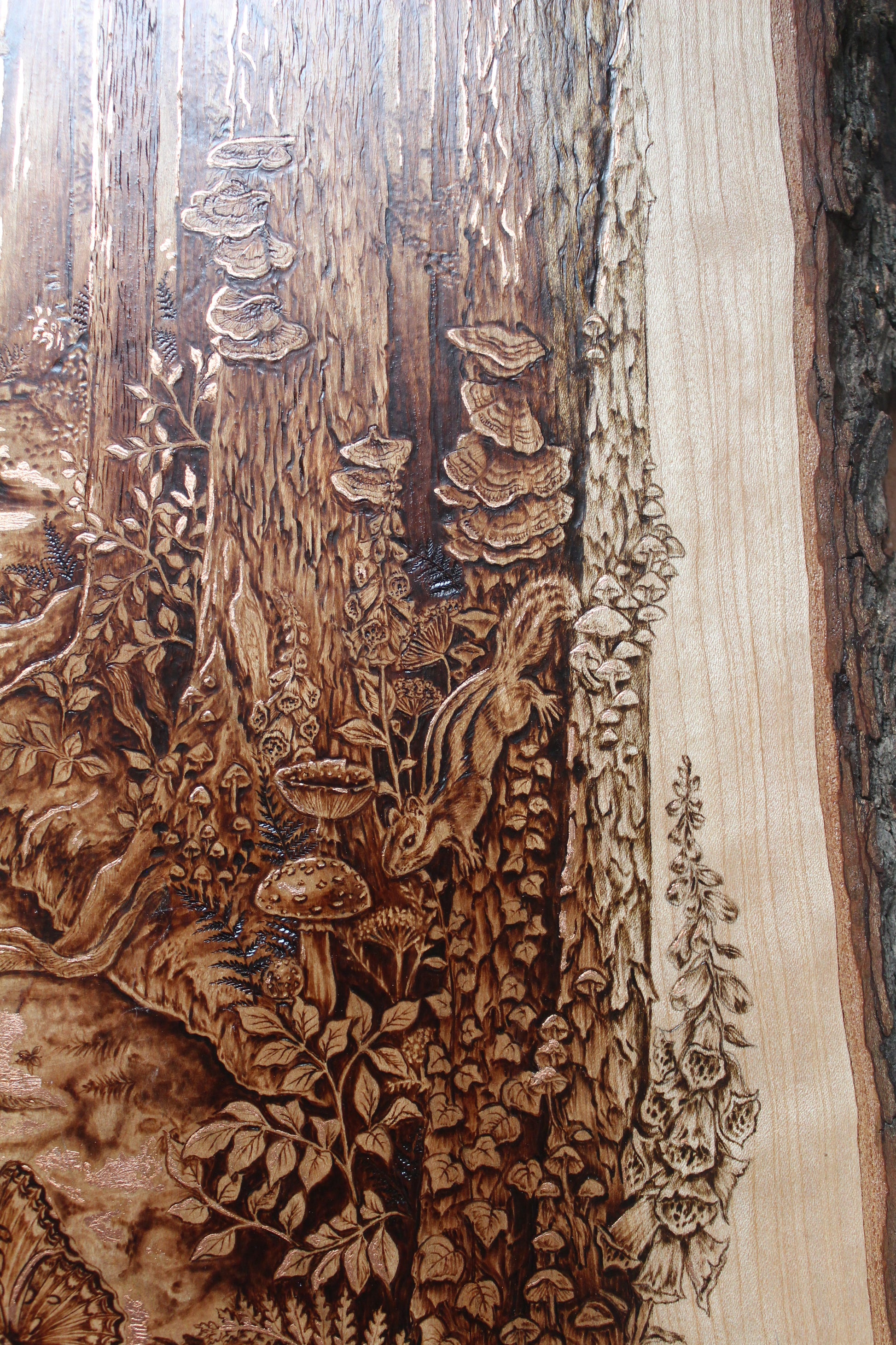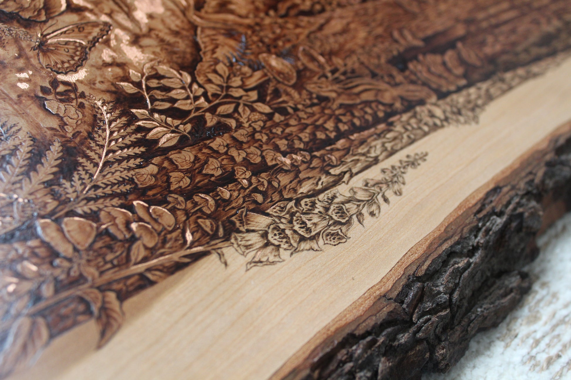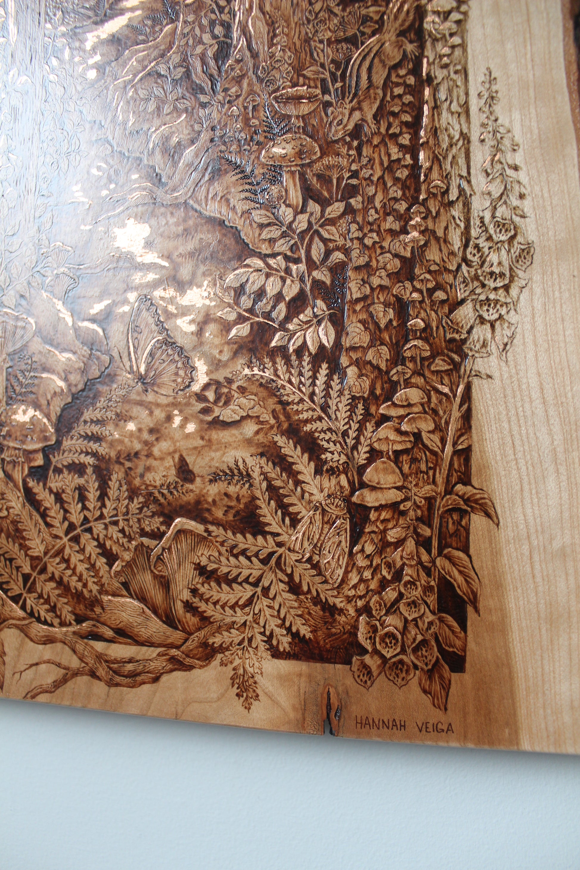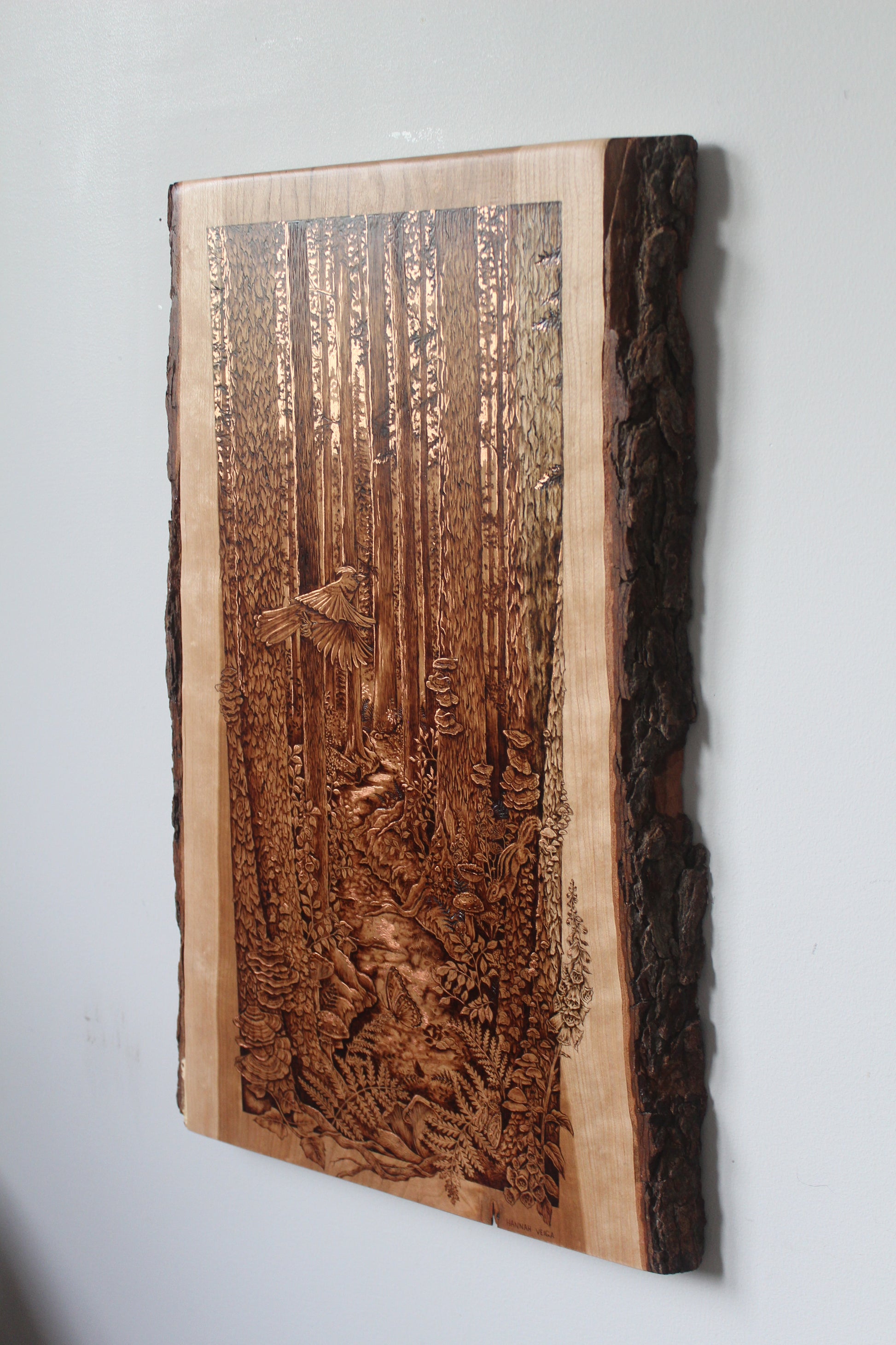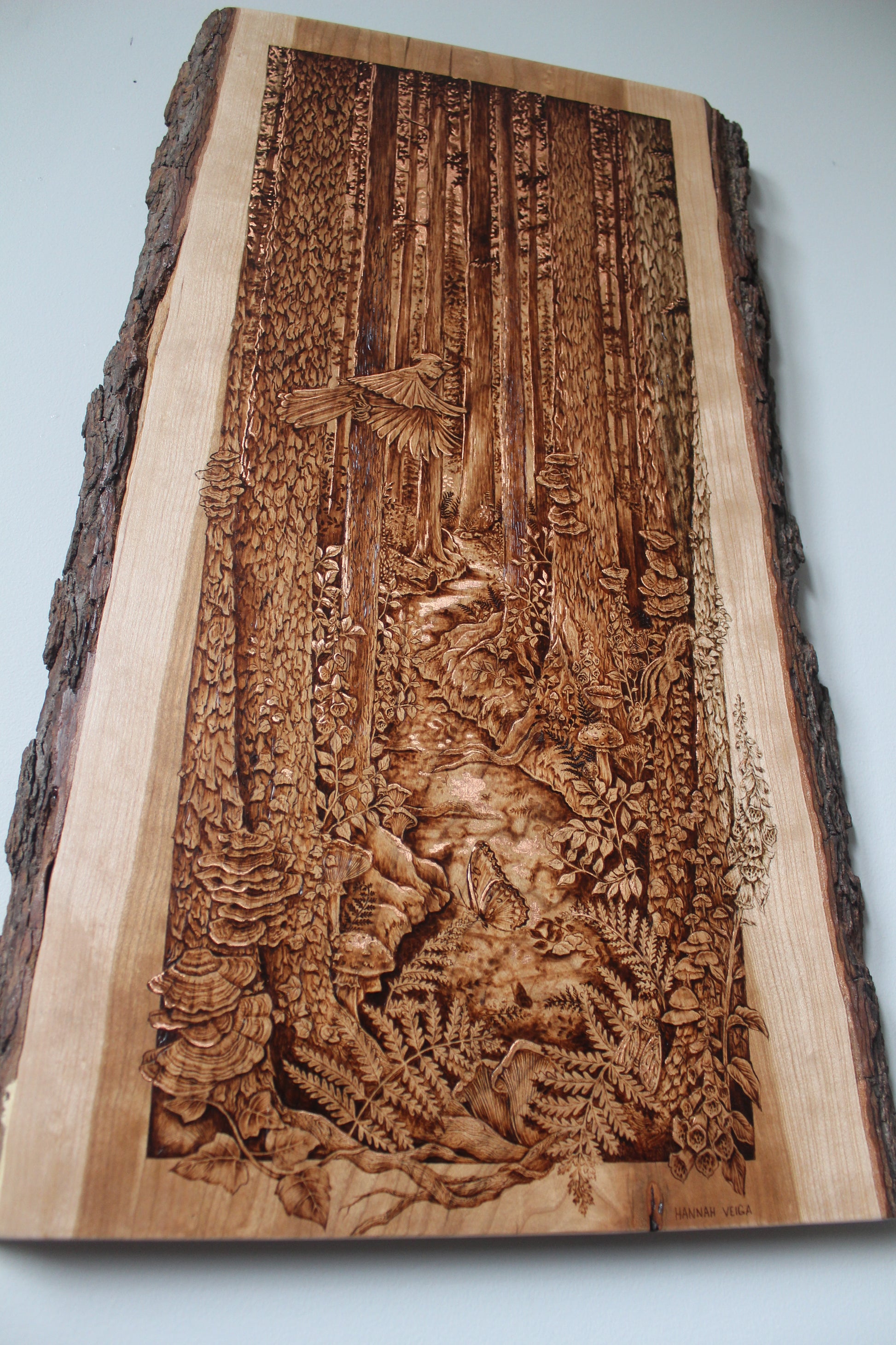 Original wood burning on a 21.5" x 13.5" inch live edge cherry, accented with genuine copper leaf.