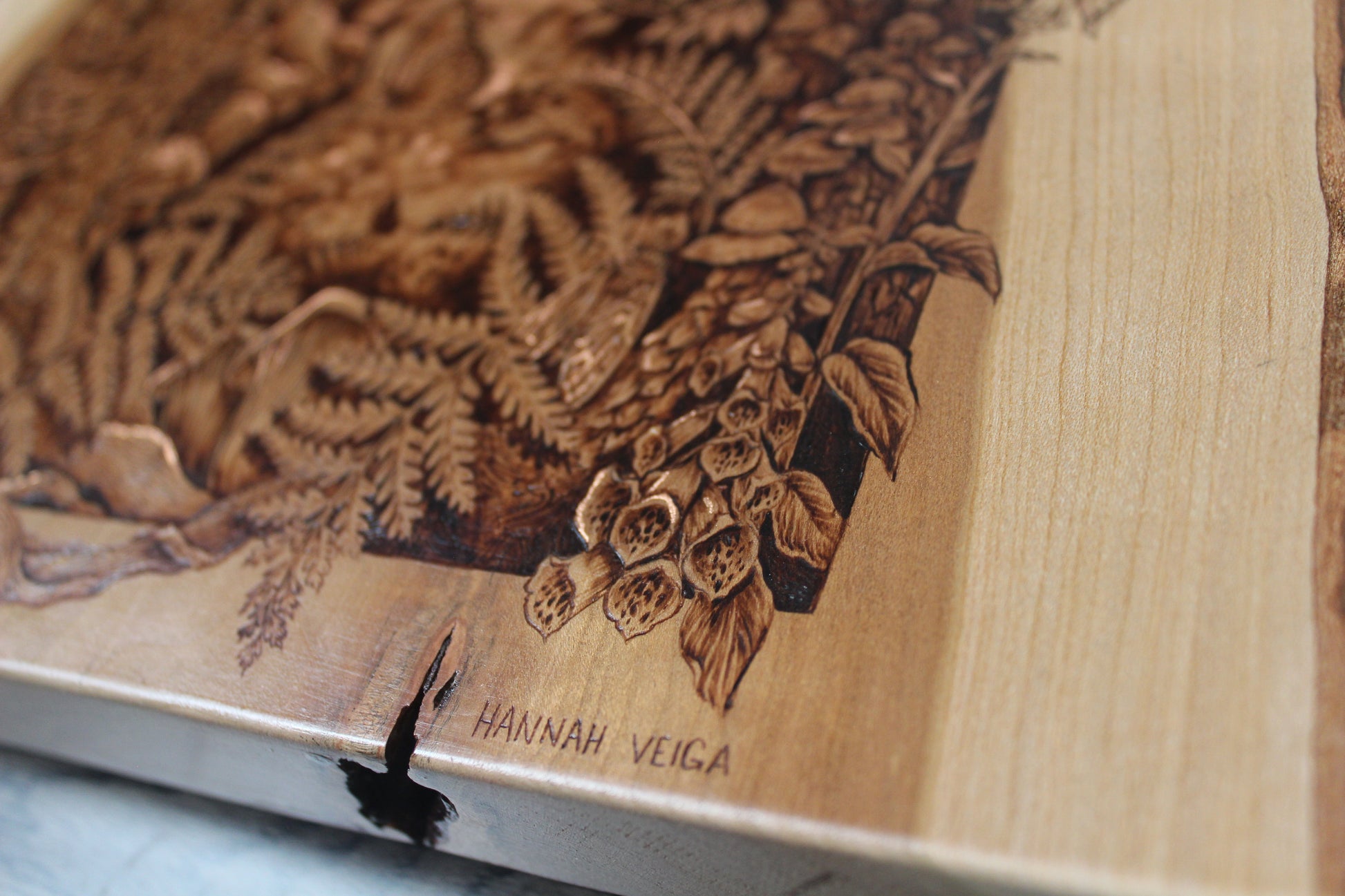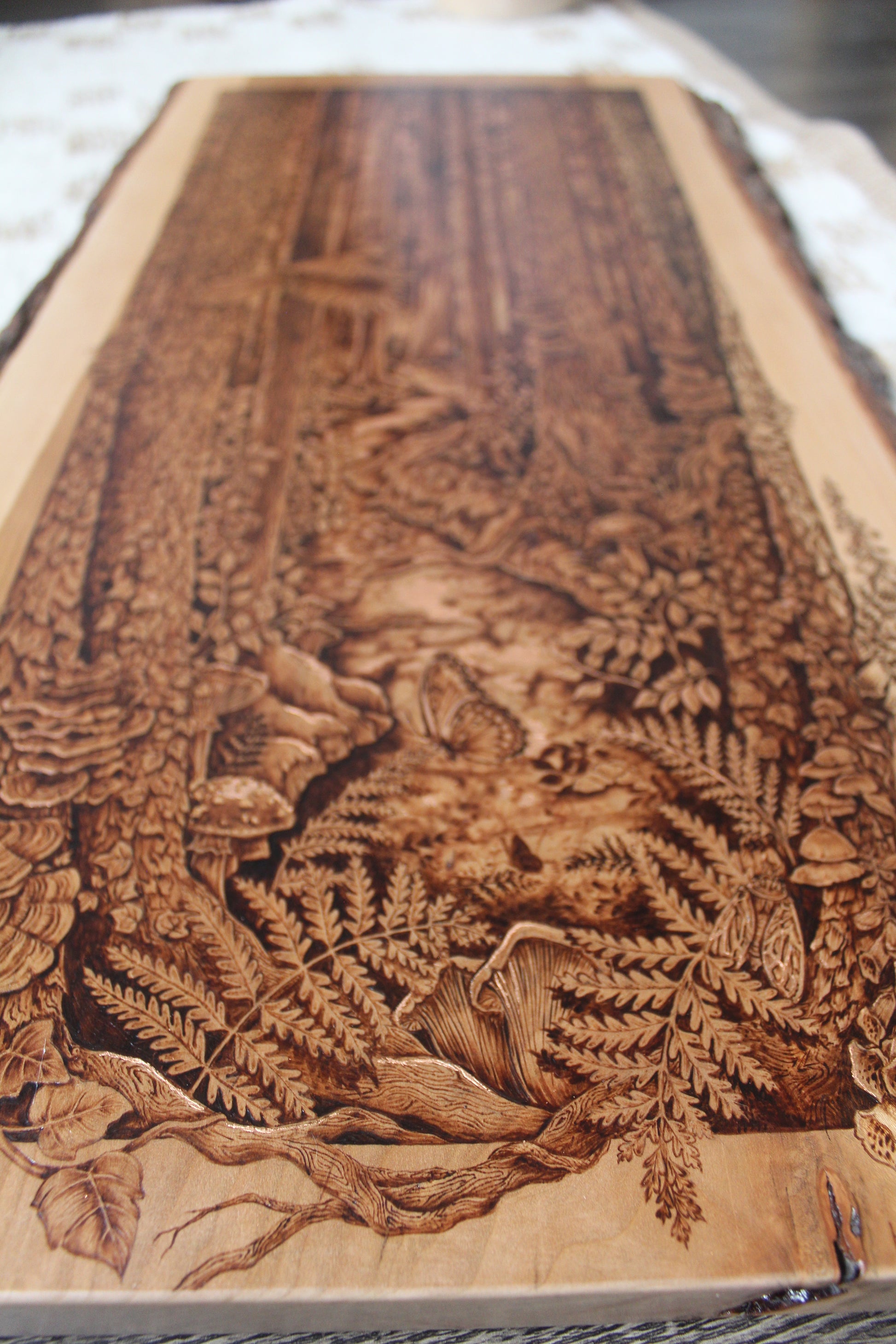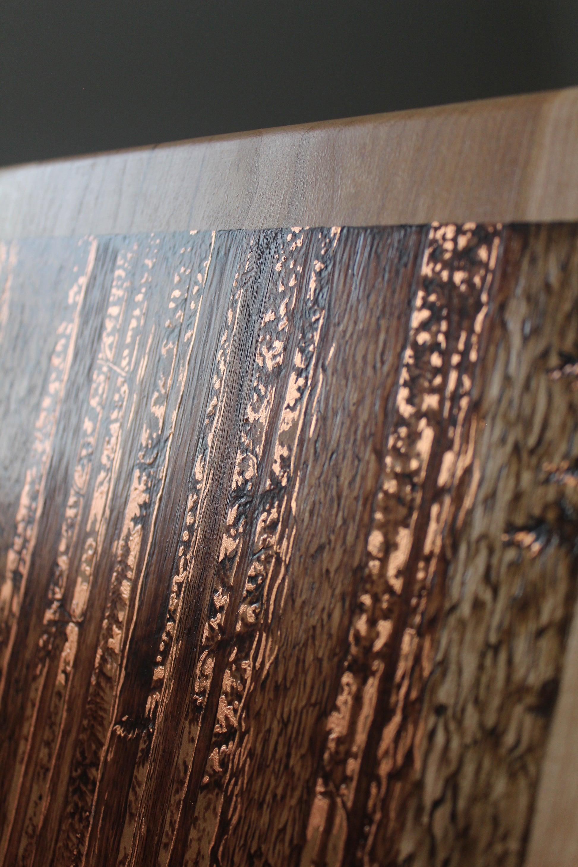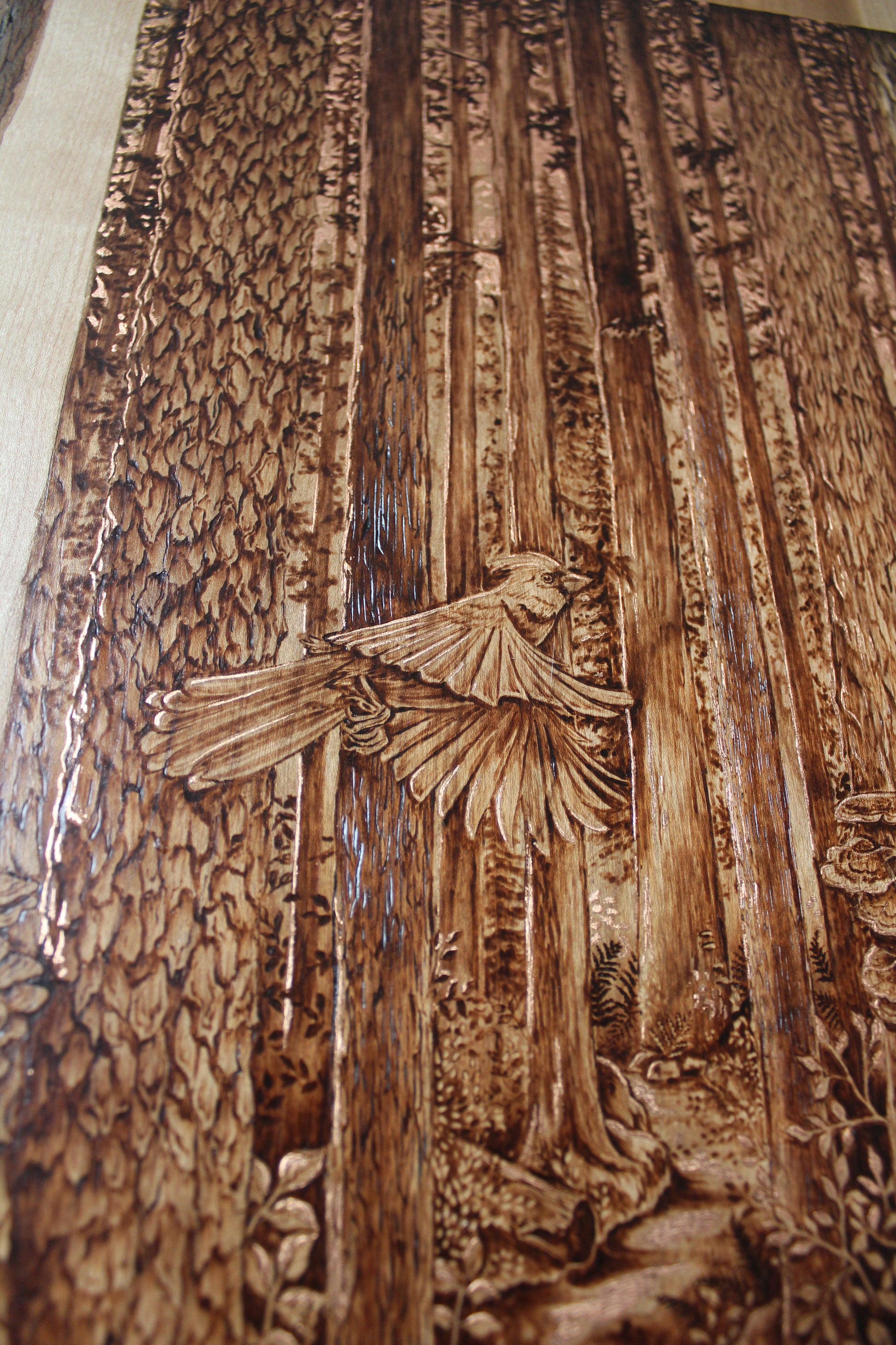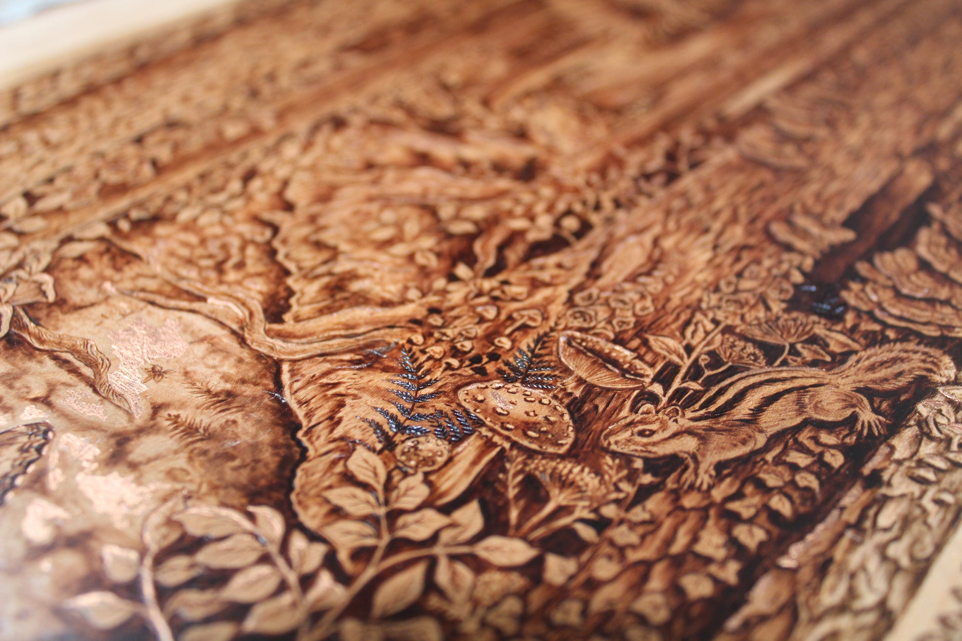 Original wood burning on a 21.5" x 13.5" inch live edge cherry, accented with genuine copper leaf.