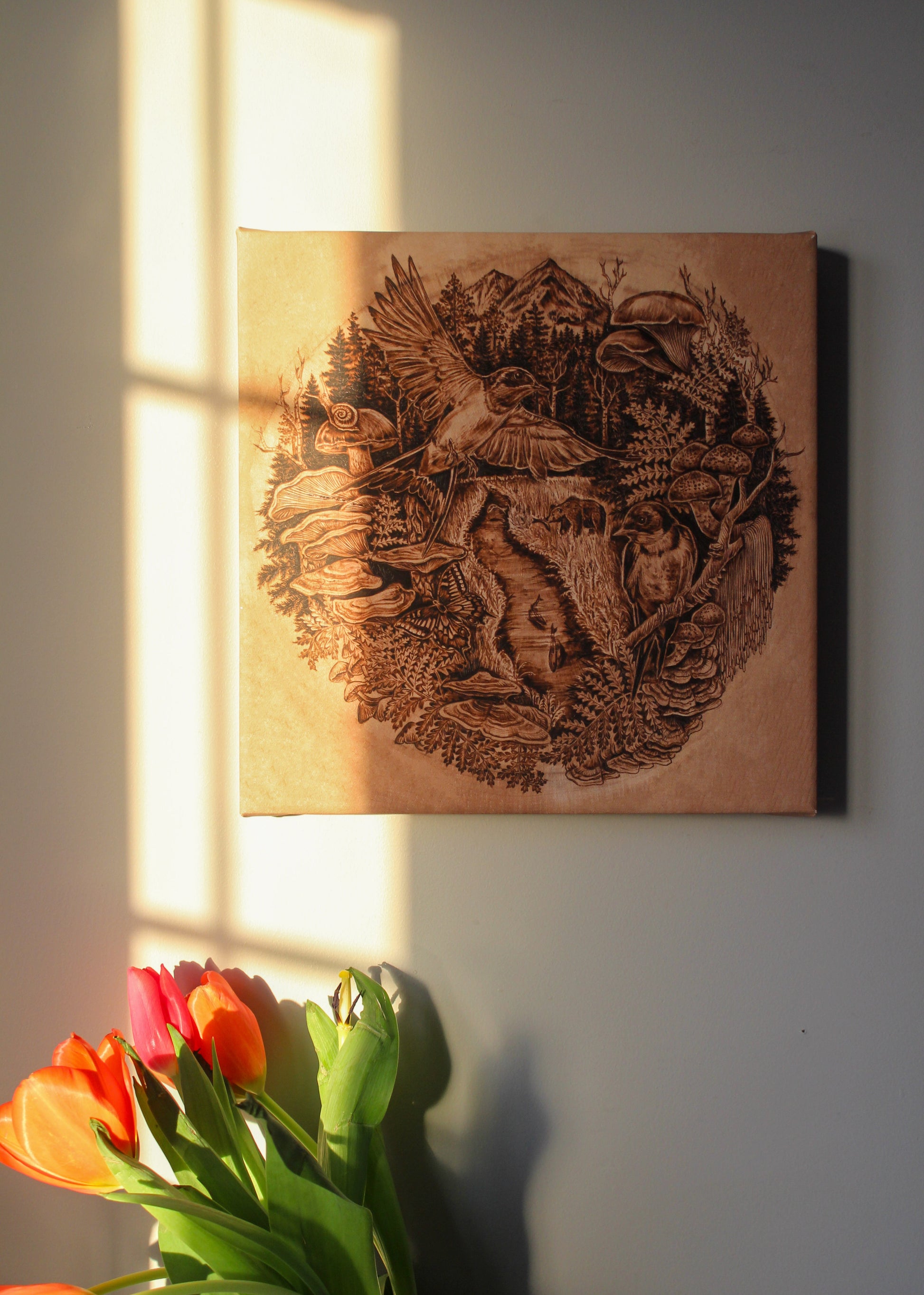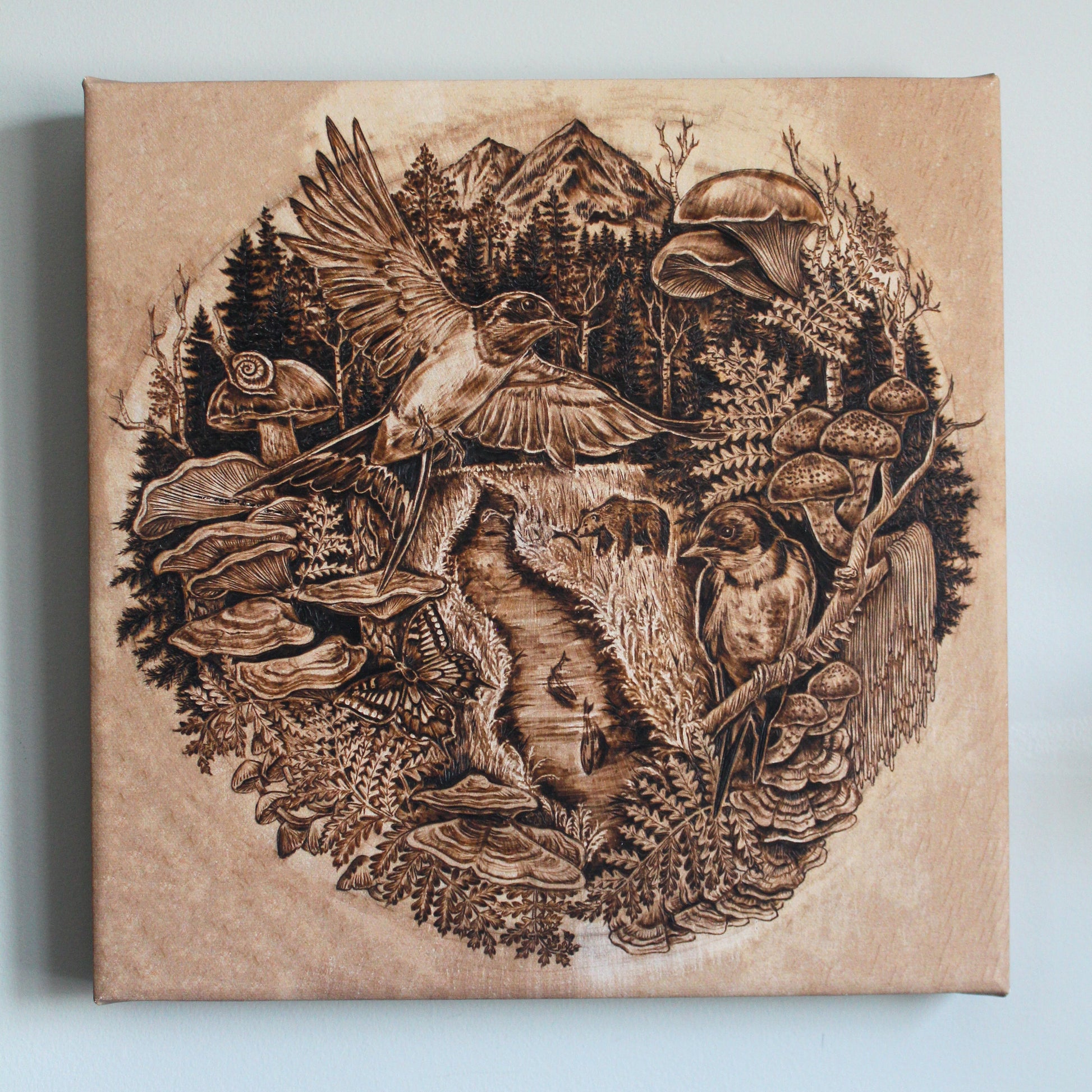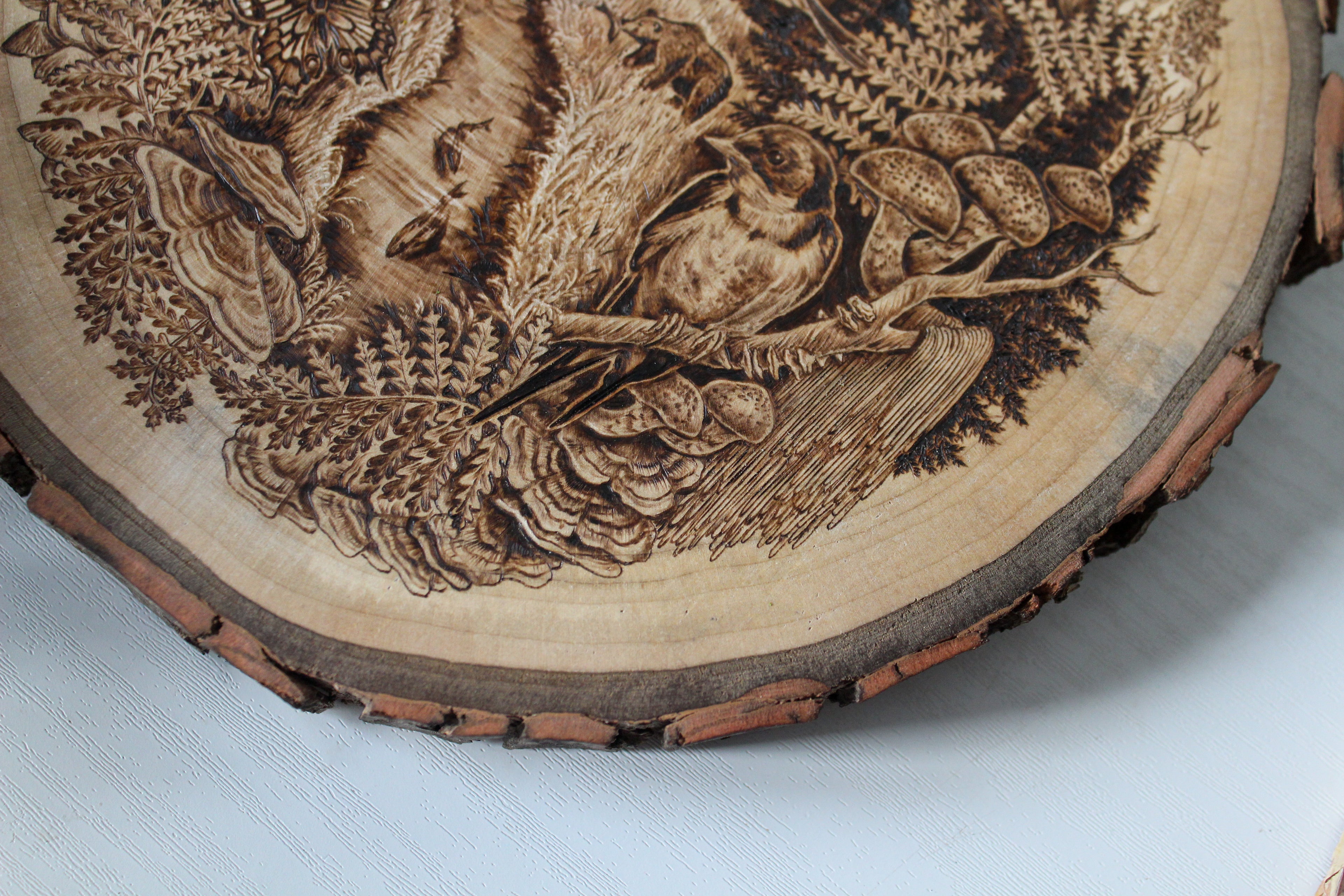 Everything has been free-hand drawn and burned using my wood burning tools on a salvaged maple round.