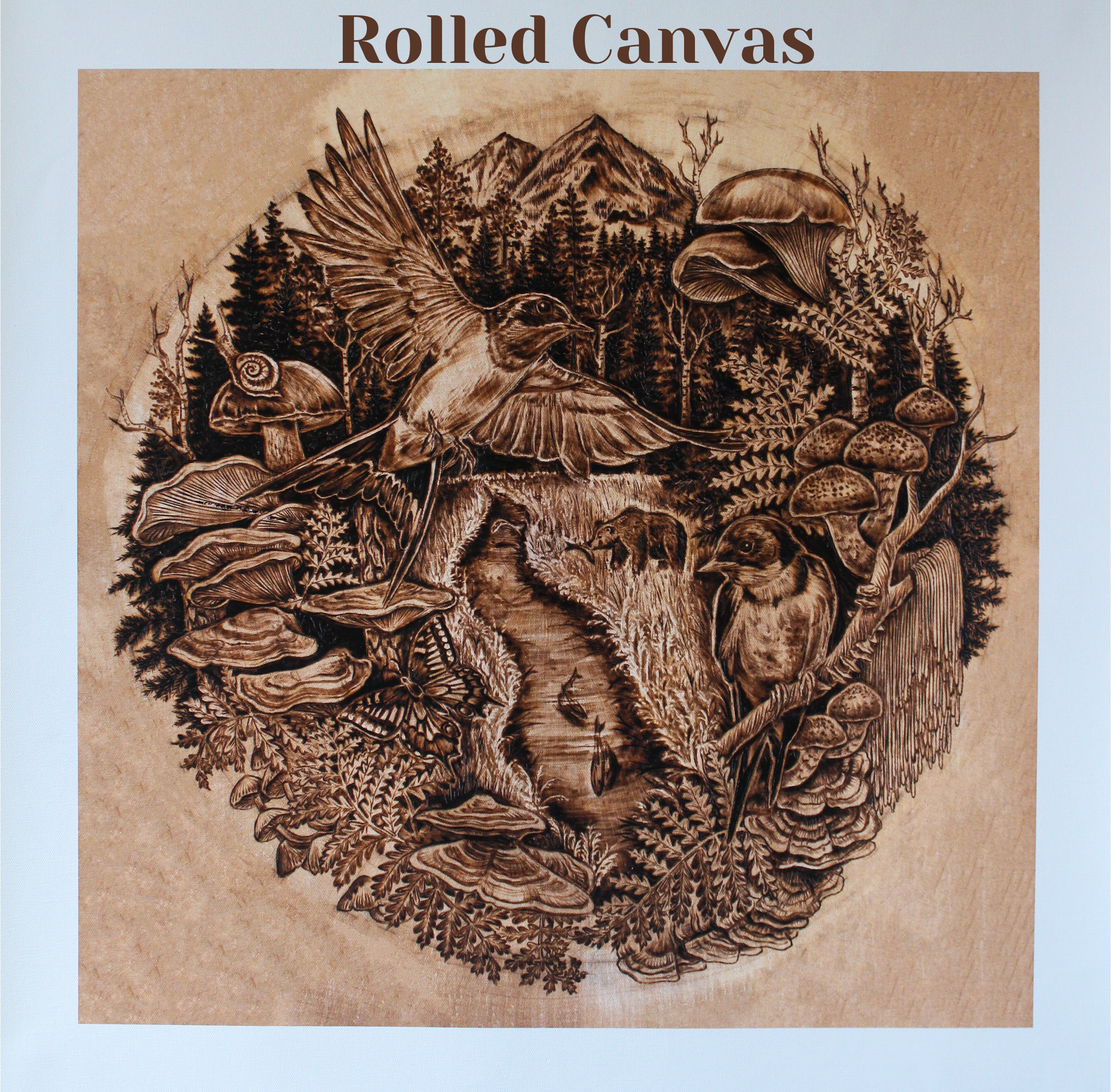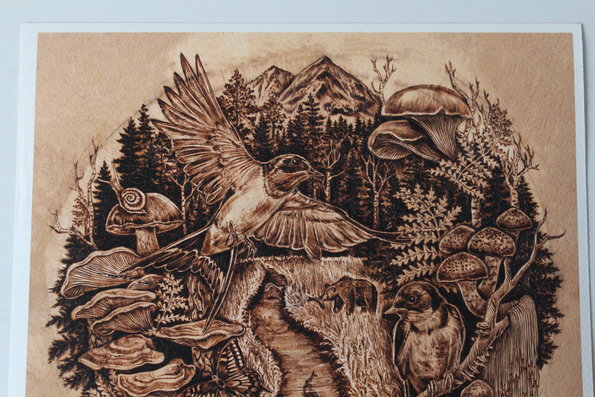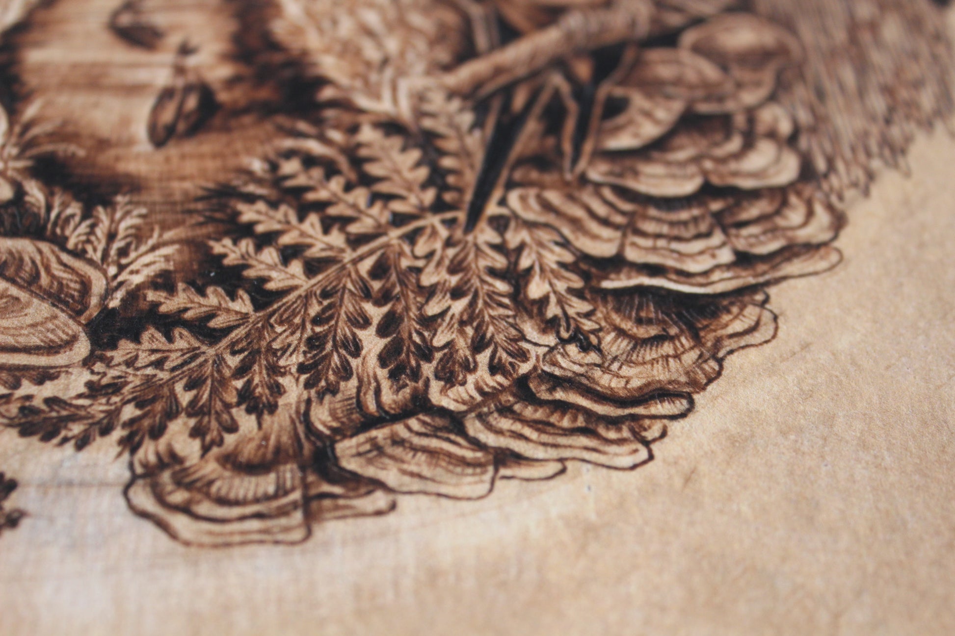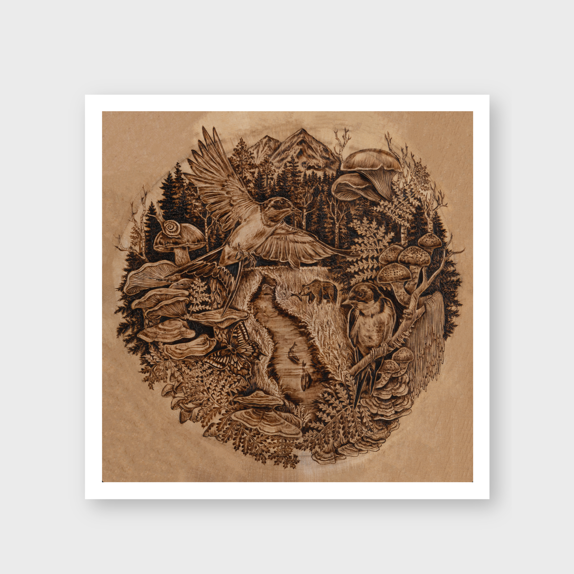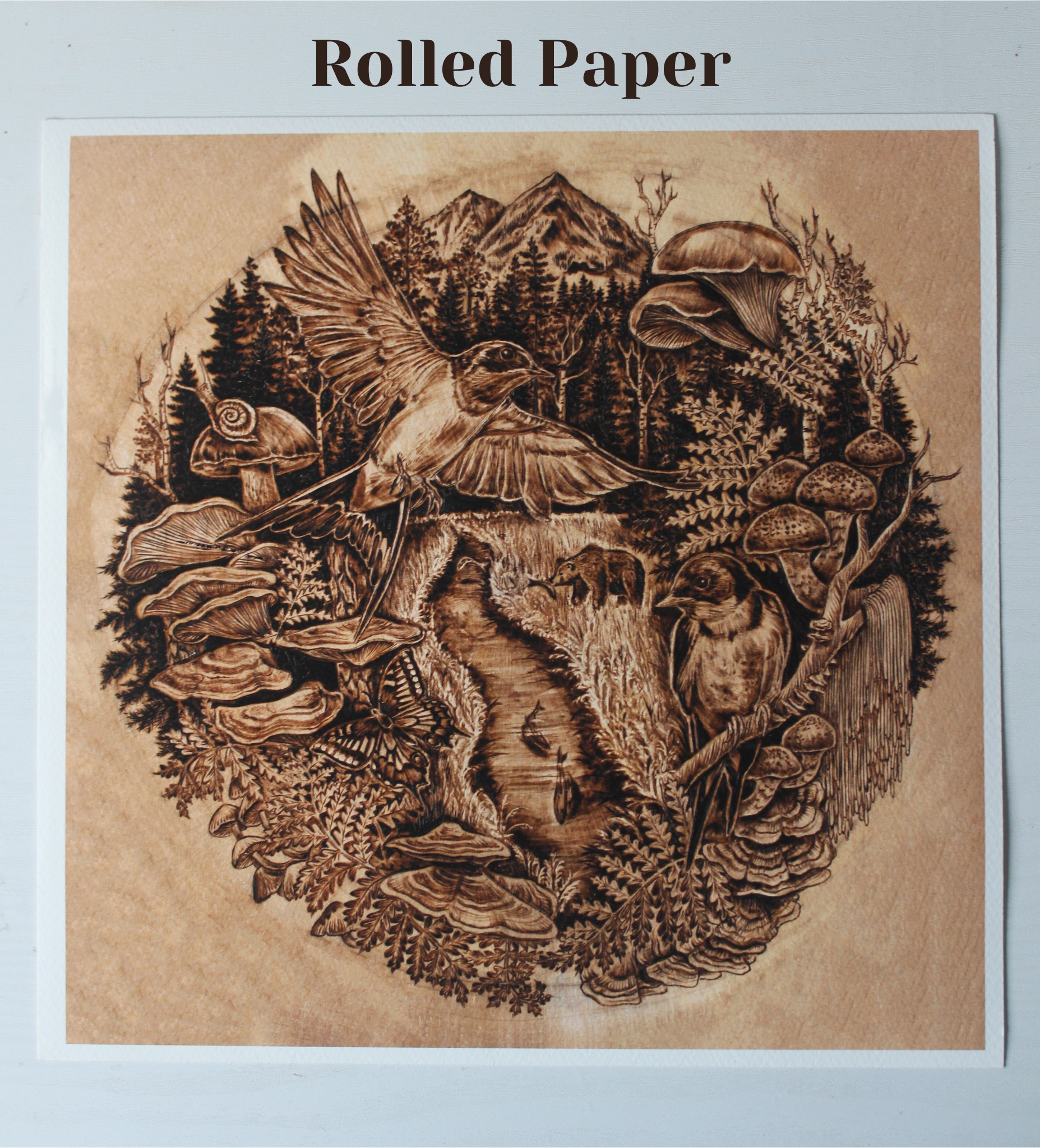 Paper prints are rendered on archival quality fine art paper, which is subtly textured to provide a more tactile experience to bring you closer to the feeling of having an original wood burning. This paper is acid-free and lignin-free, ensuring that the prints remain vibrant and intact over time without fading or yellowing.