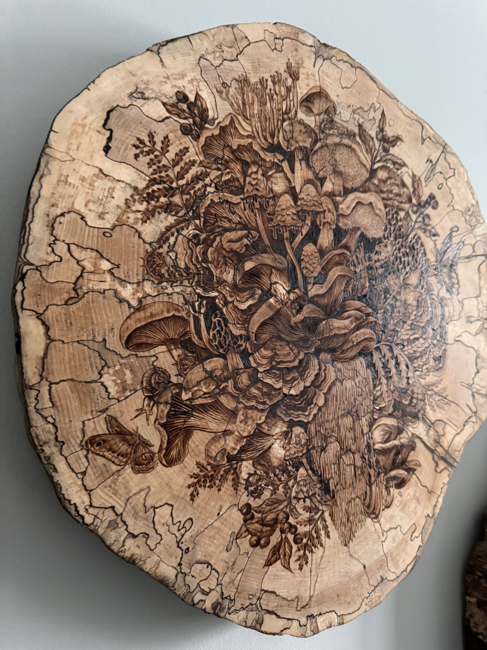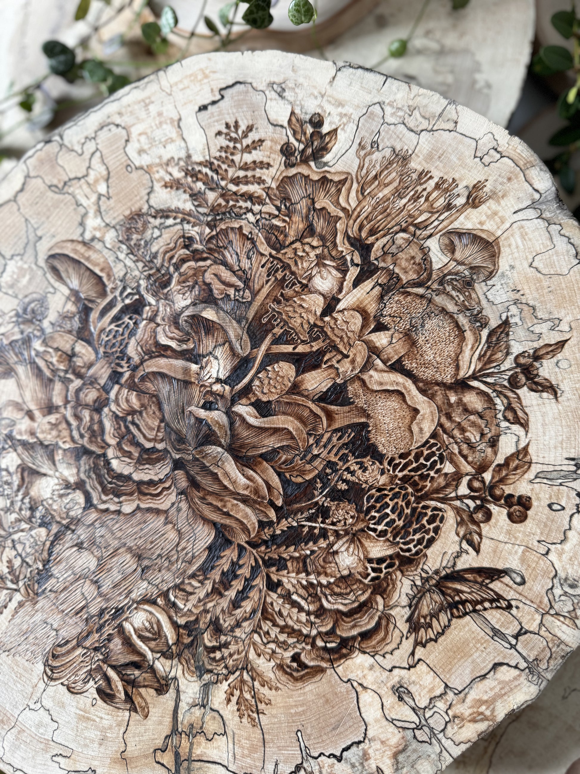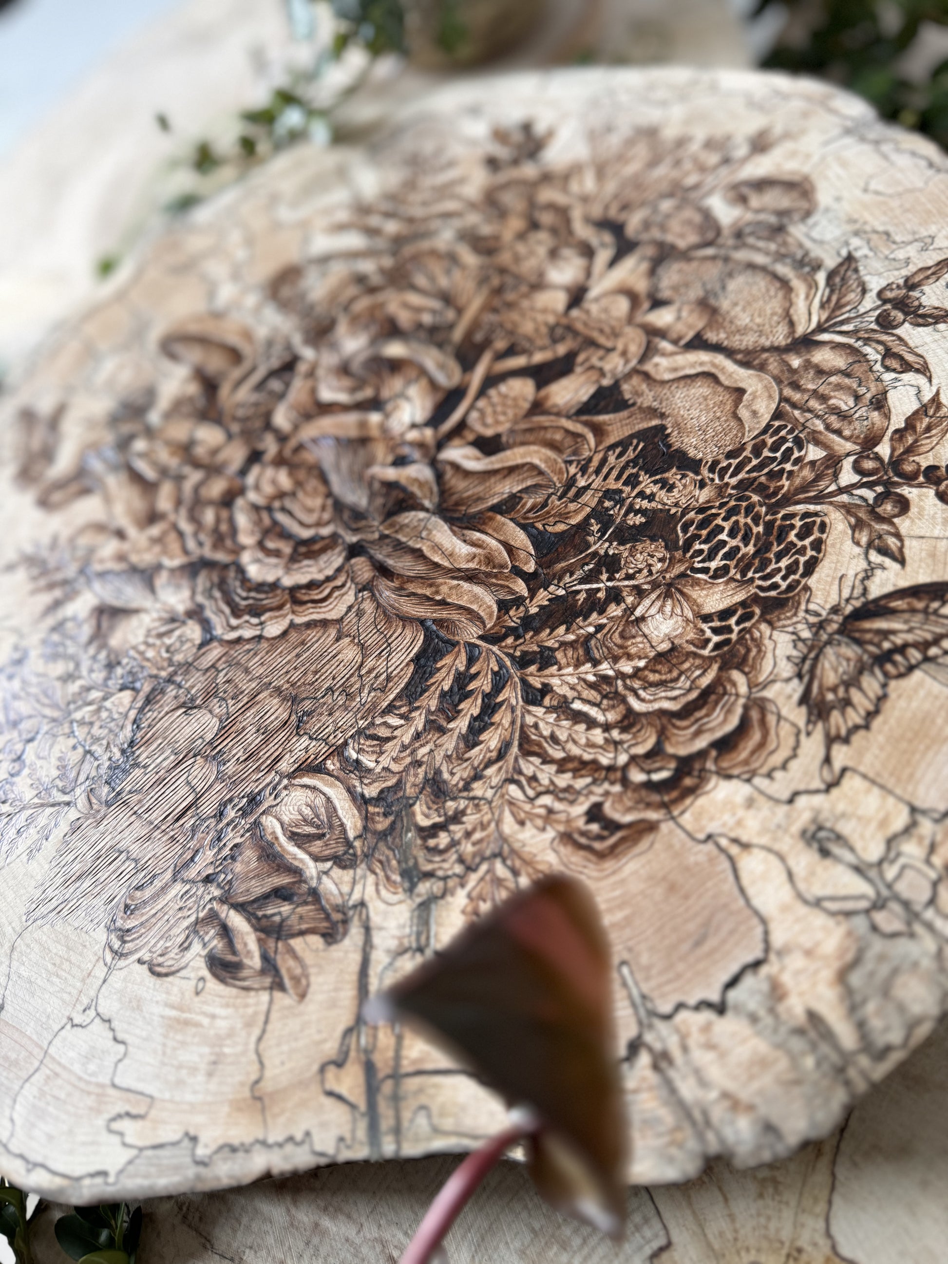 The Lovely is an original wood burning on a roughly 12 x 12 x 1.5 inch live edge spalted maple round, handmade by artist Hannah Veiga.