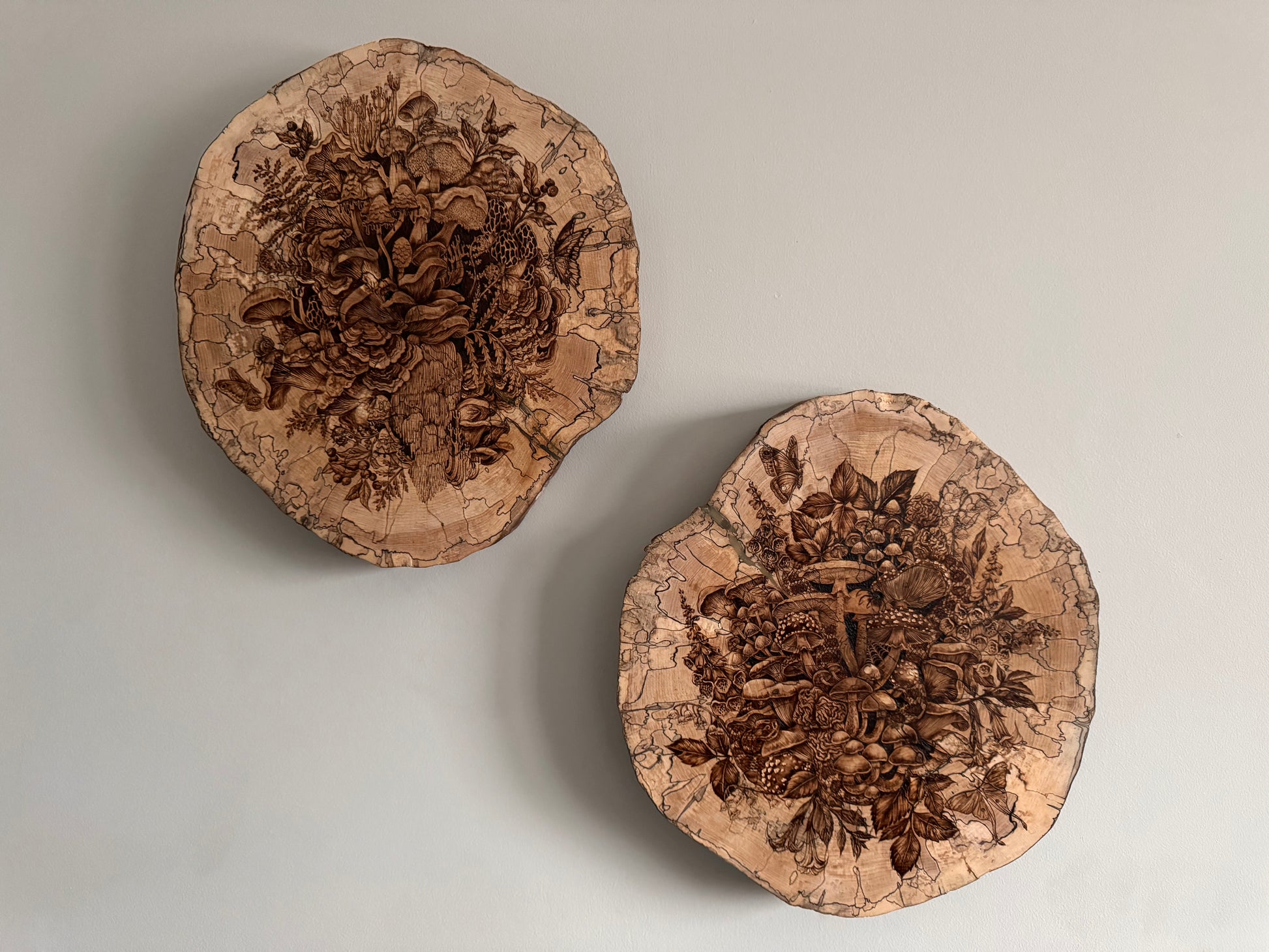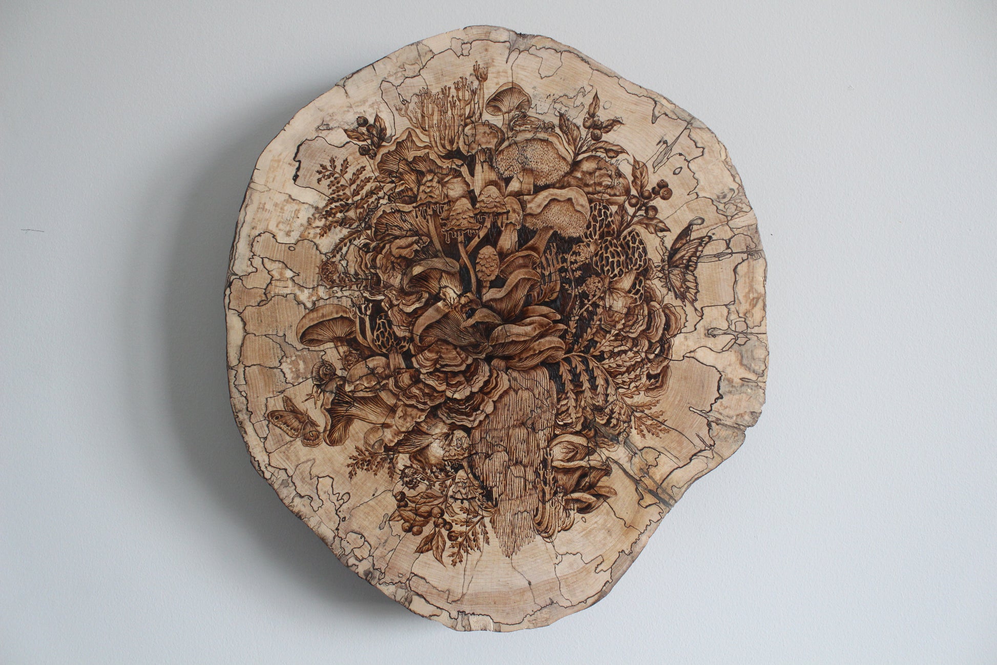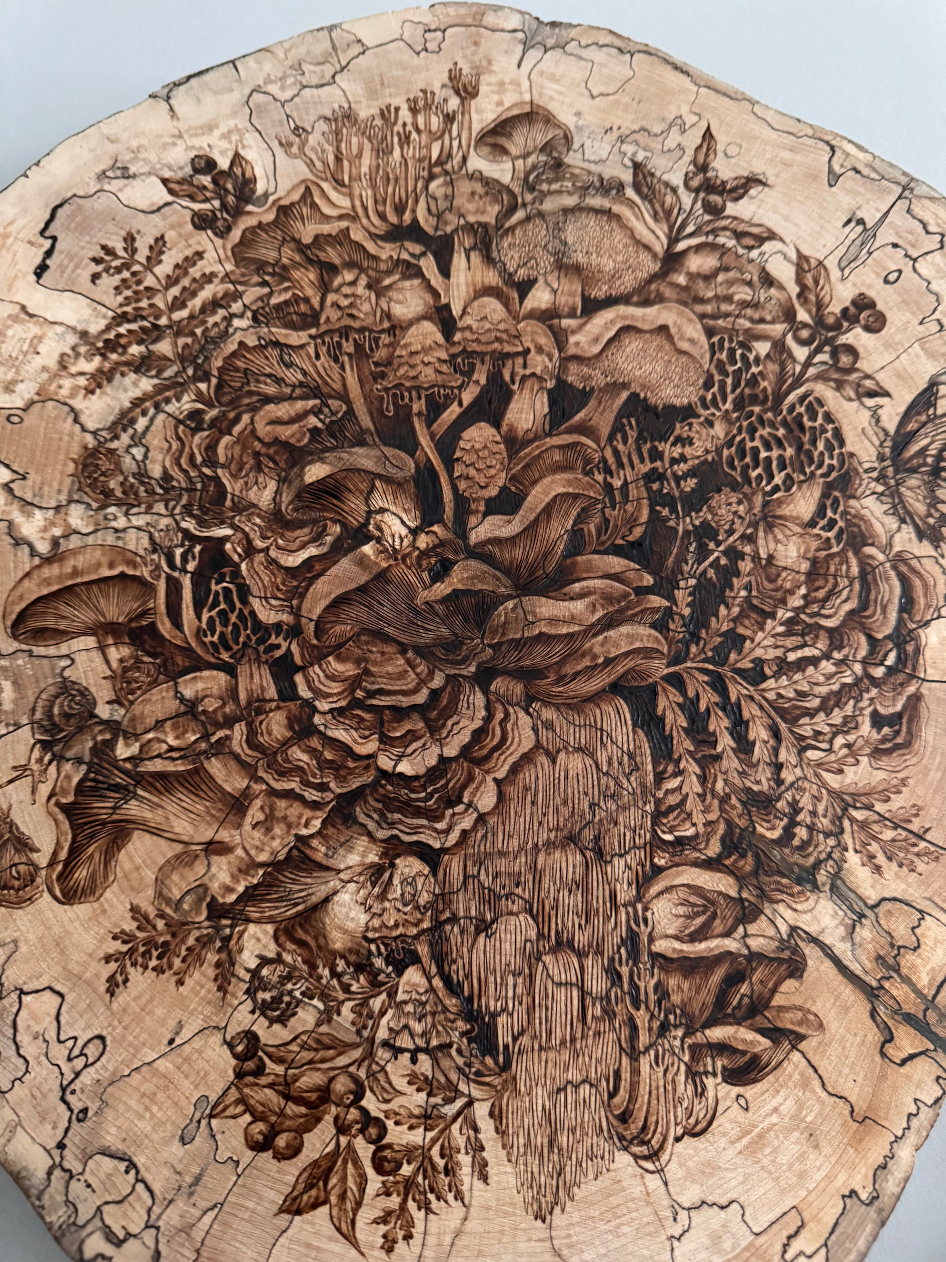 The Lovely is an original wood burning on a roughly 12 x 12 x 1.5 inch live edge spalted maple round, handmade by artist Hannah Veiga.
