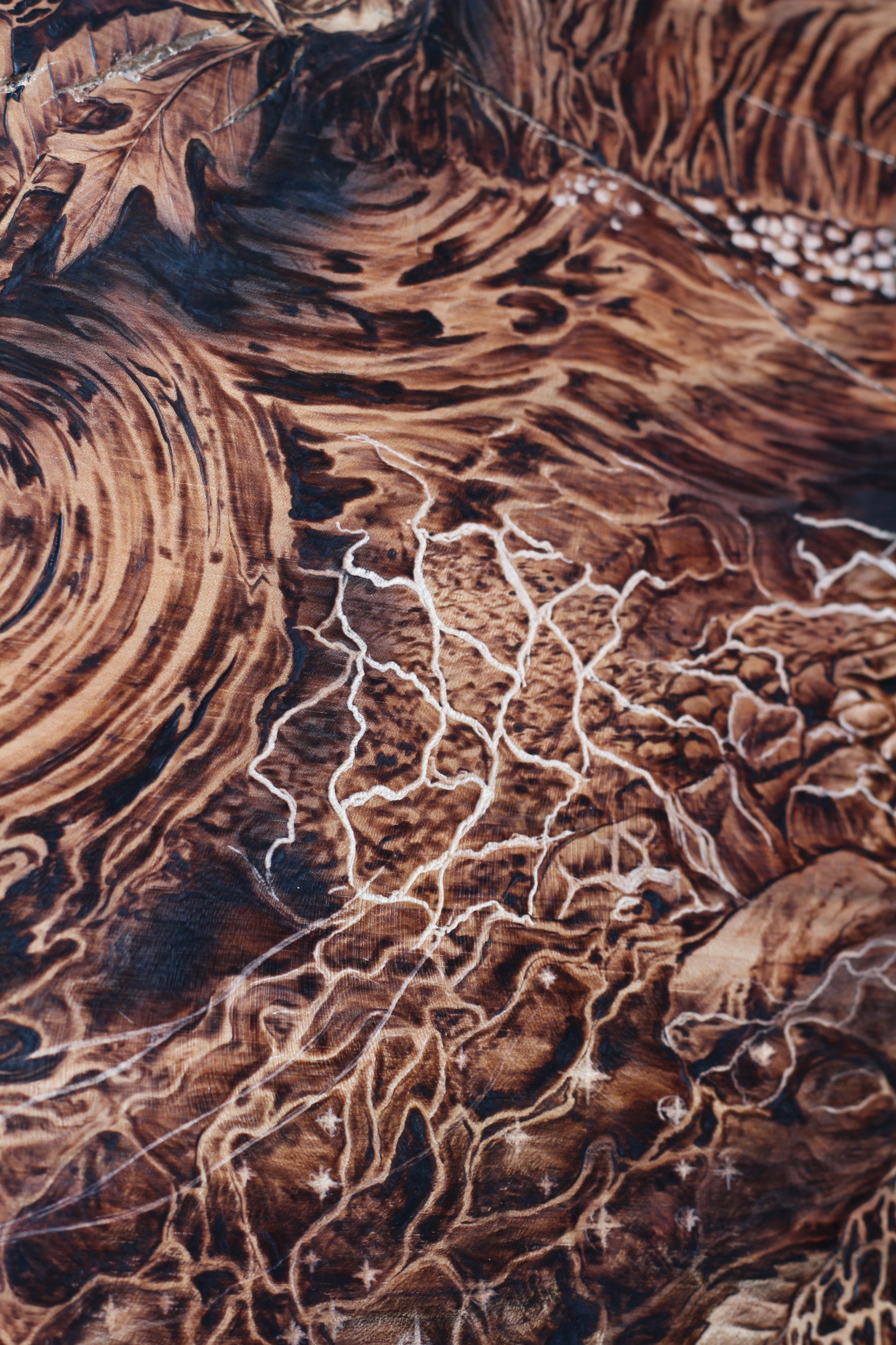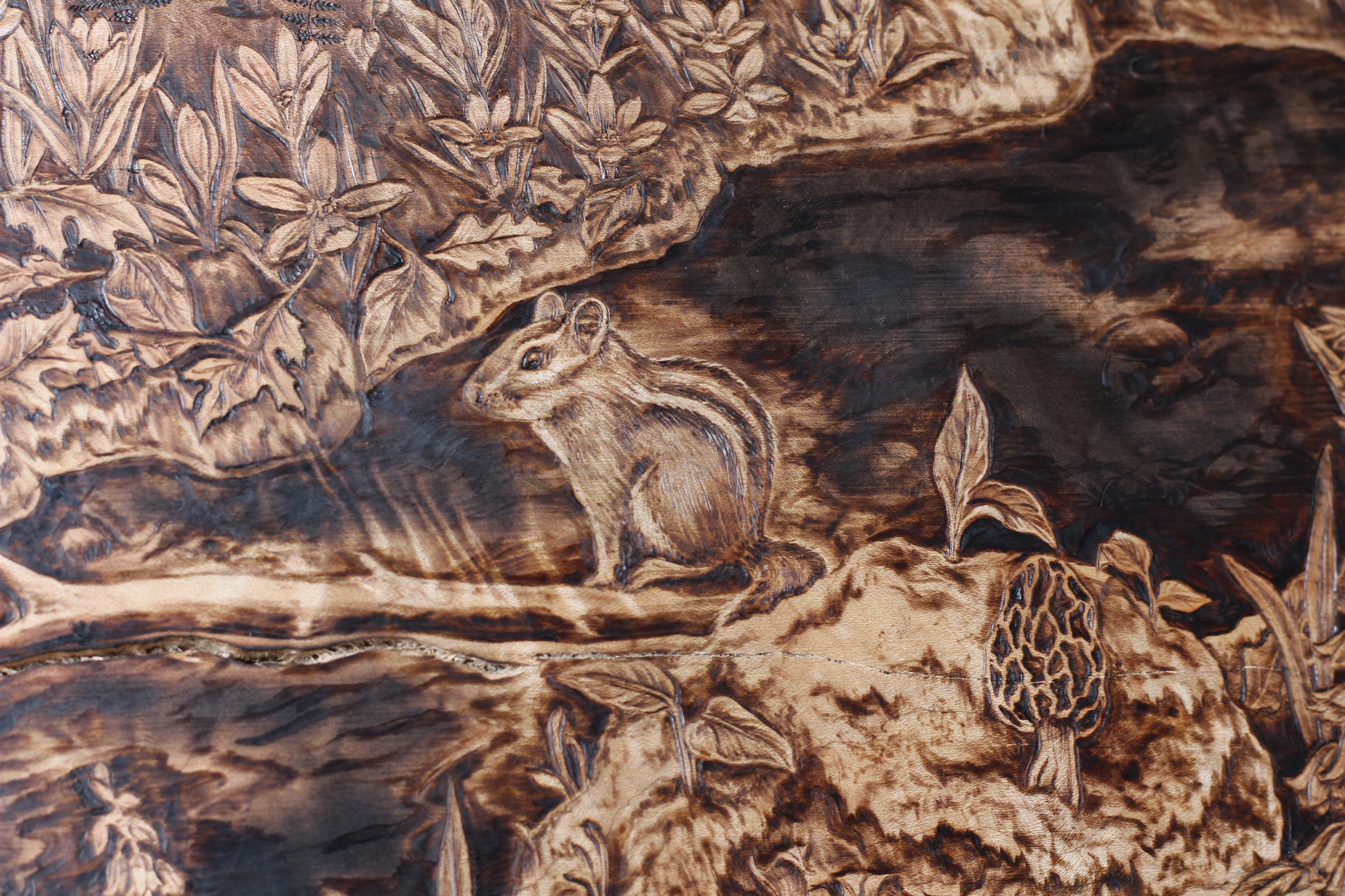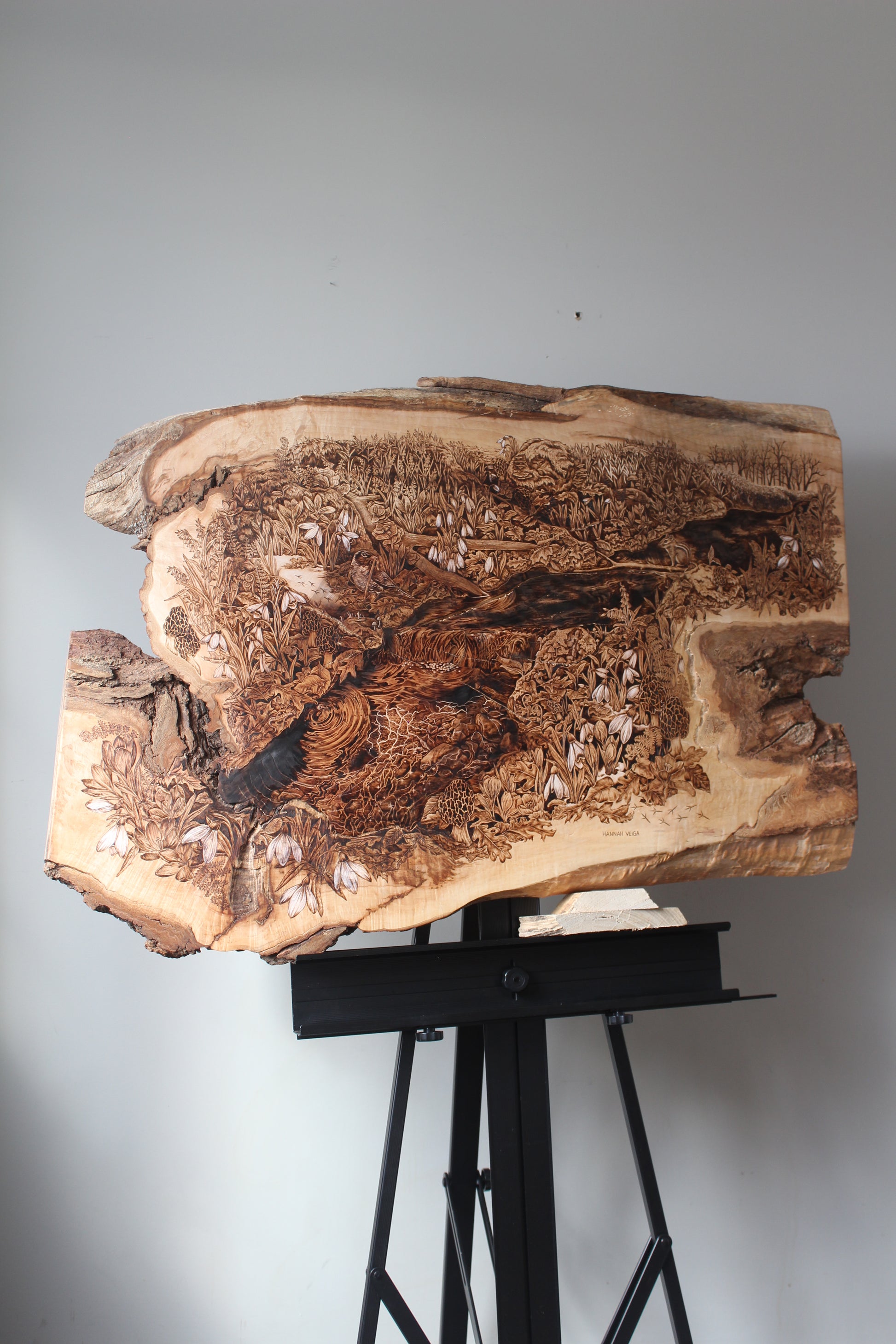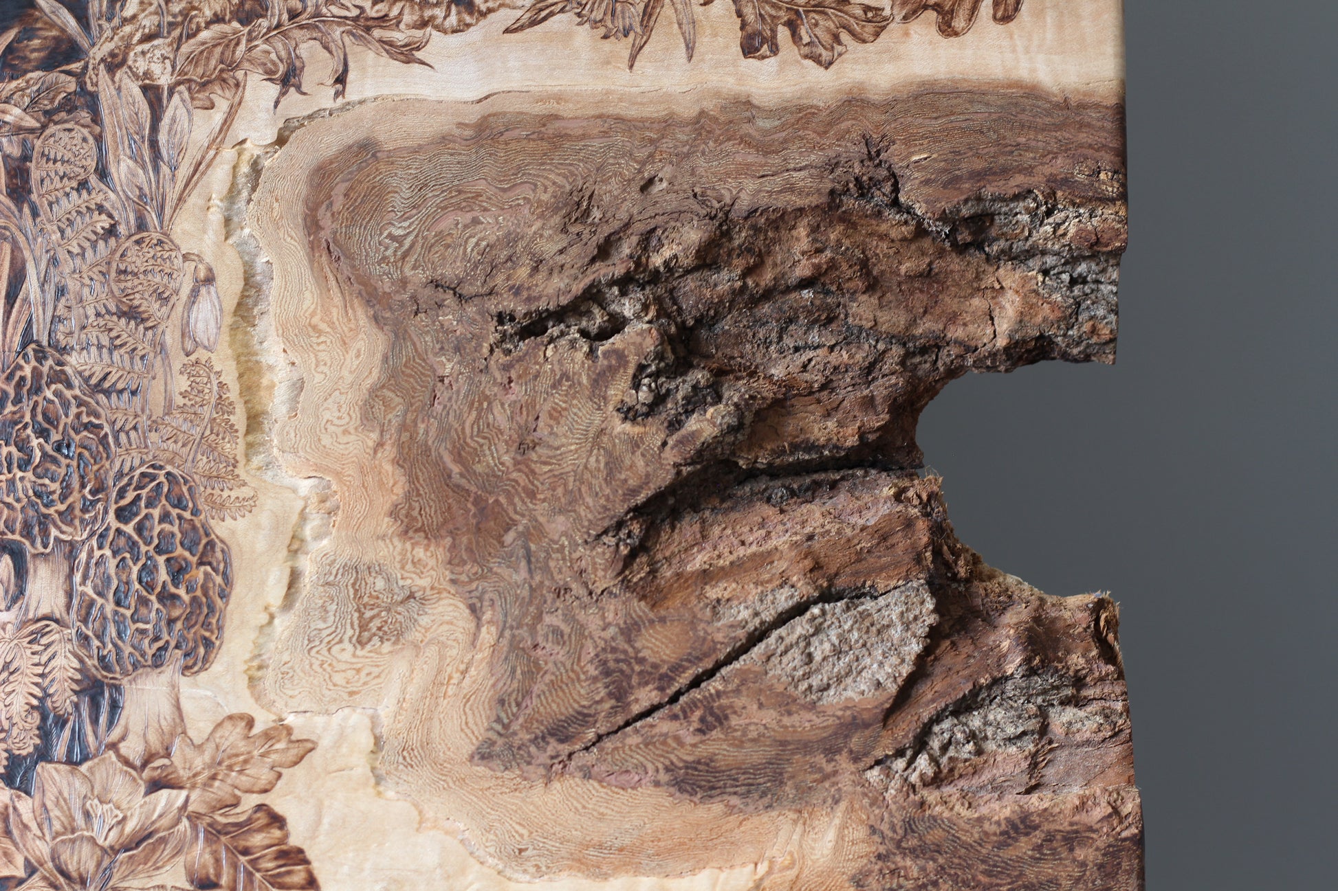 The Slow Reveal is an original woodburning on a 28.5" x 26.5" x 1.75" live edge, salvaged maple sourced locally here in Ontario. This piece has been sealed with non-toxic, water-based polycrylic to ensure the integrity of the artwork and the wood.